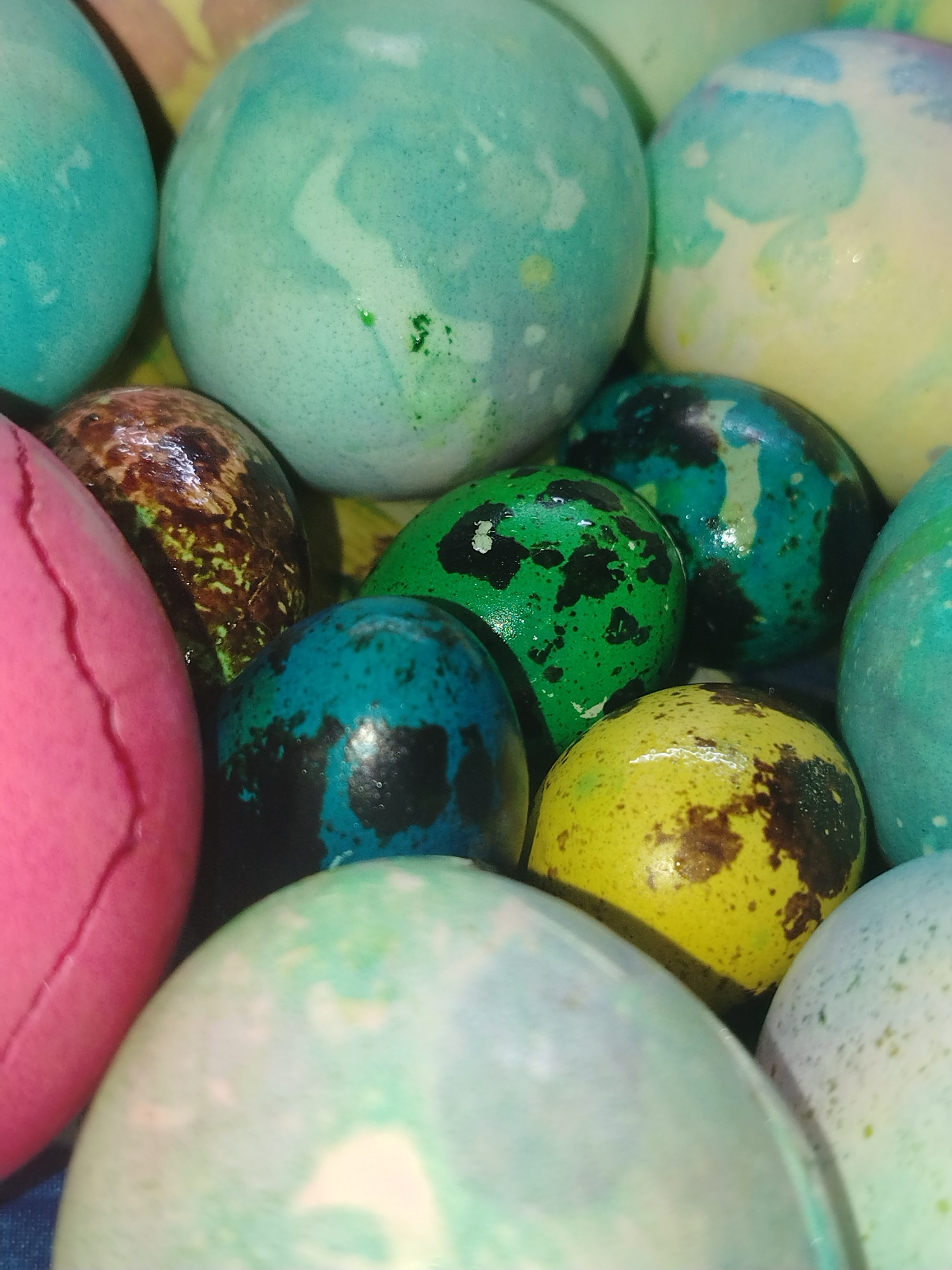 The image shows a collection of dyed eggs in various colors and patterns. Colors include blue, green, pink, yellow, and brown with marbled, speckled, and solid patterns. The eggs are clustered togetheโฆread more