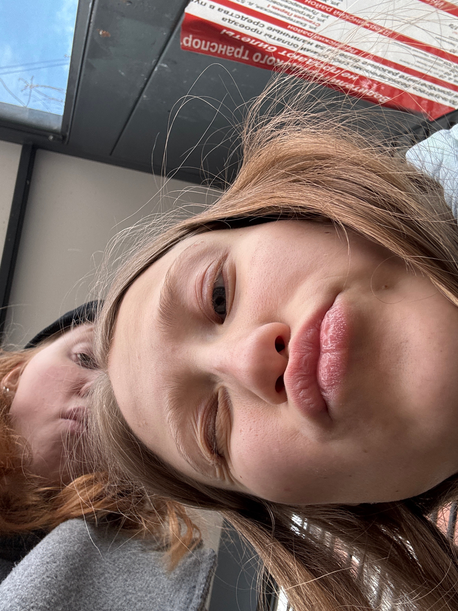 A selfie angled upward features a young woman with blonde hair and one eye closed. A sign in the background indicates the location is in Perm, Russia, specifically near the Yekaterininskaya street, Pe…read more