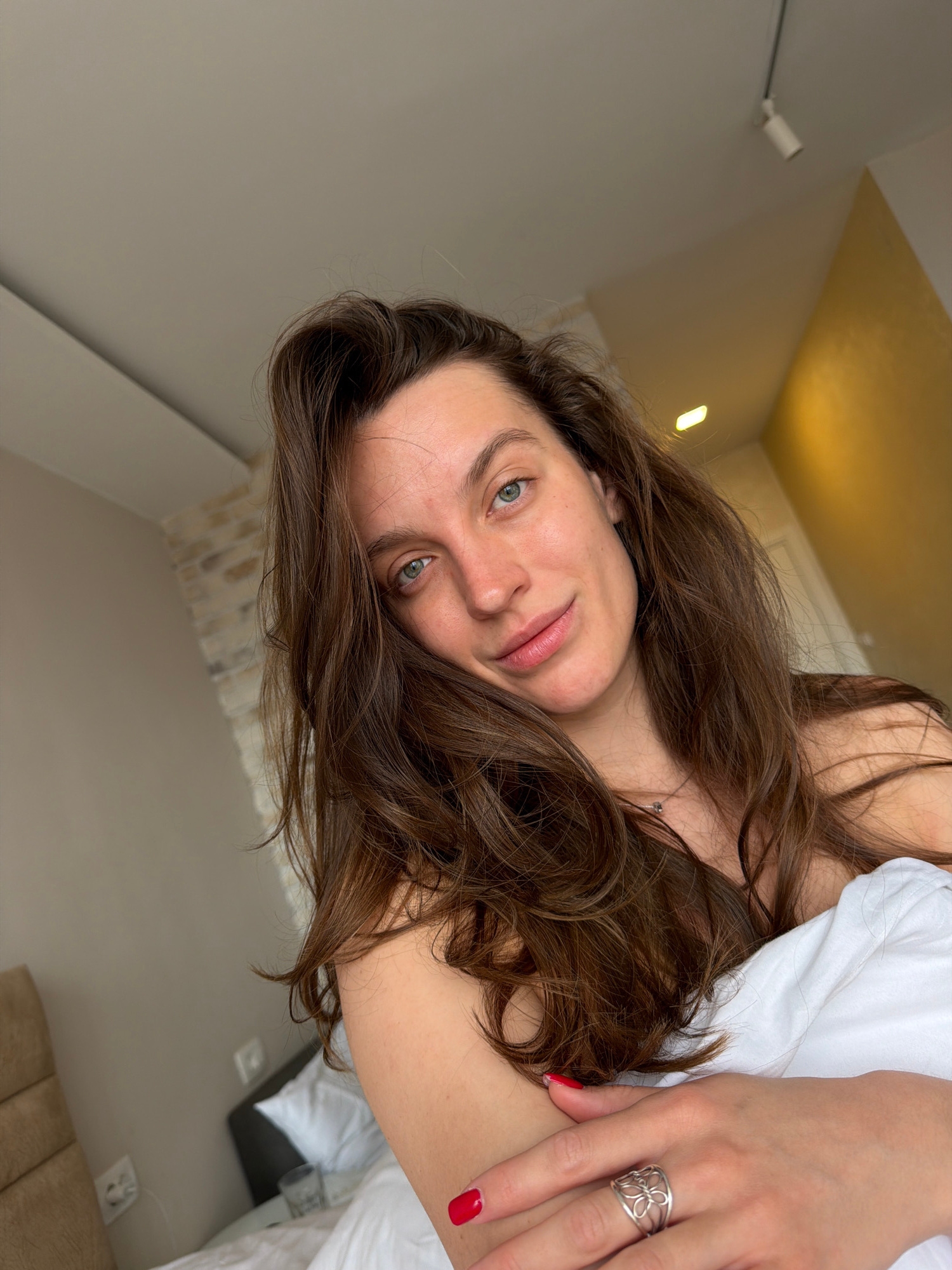 A young adult woman with fair skin and long, brown hair is lying down, possibly in bed, in a brightly lit interior. She has light-colored eyes and a slightly pink complexion. Her right hand, adorned w…read more
