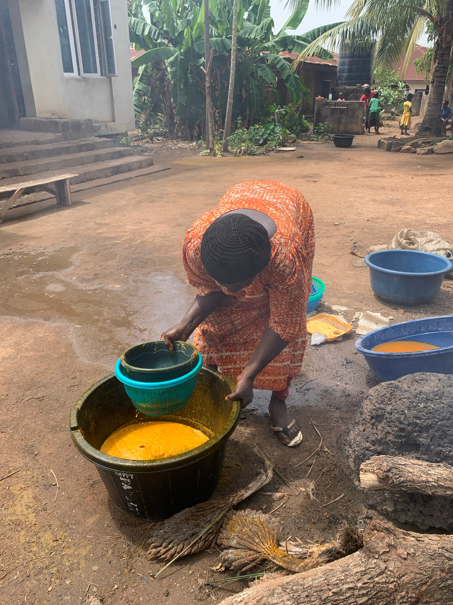 An overhead shot depicts a woman in Akwanga, Nigeria, wearing an orange patterned dress and a black head covering, bent over pouring liquid from a blue-rimmed green plastic basket into a black plastic…read more