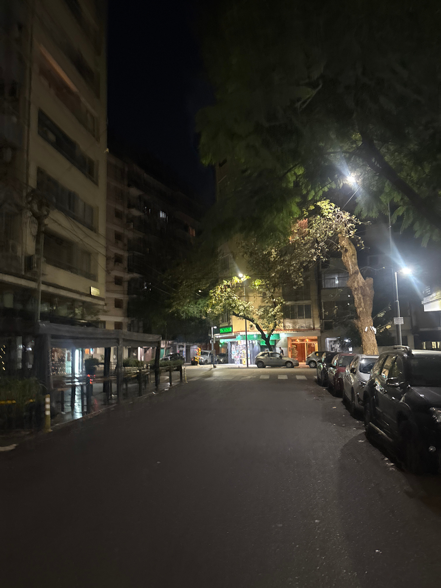 The image depicts a street scene at night in Buenos Aires, Argentina. The perspective is from street level looking down the road. On the right side of the frame, parked cars line the curb. The street…read more