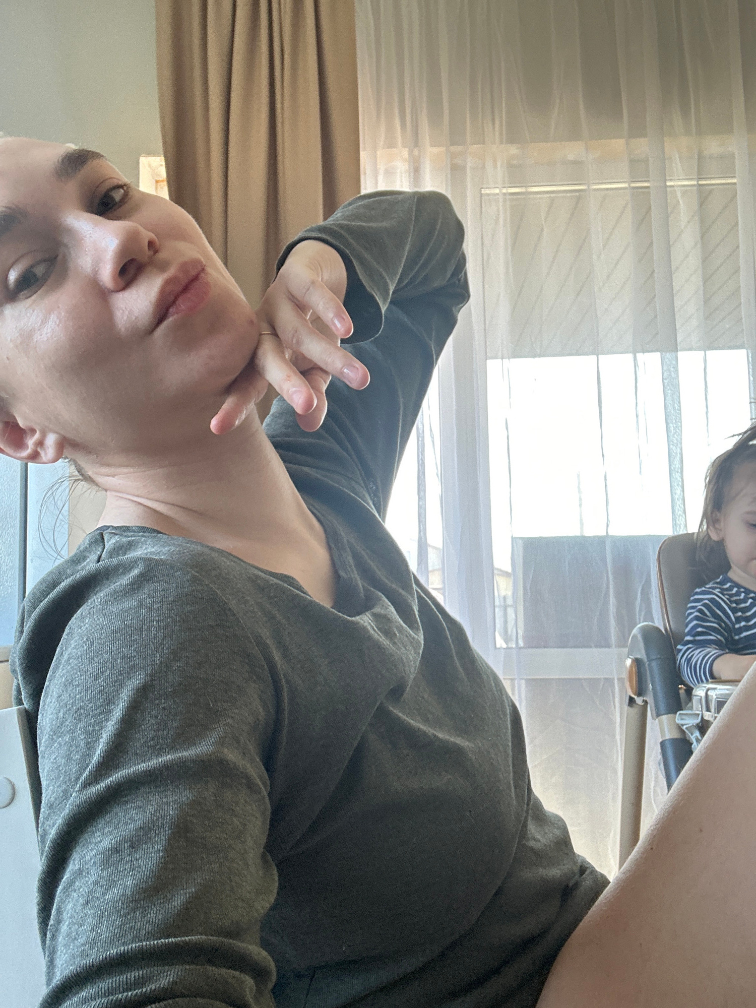 A woman with short, light hair and a gray long-sleeved shirt is facing the camera with a downward tilt. She is touching her face with her hand. A child with dark hair wearing a striped shirt is visibl…read more