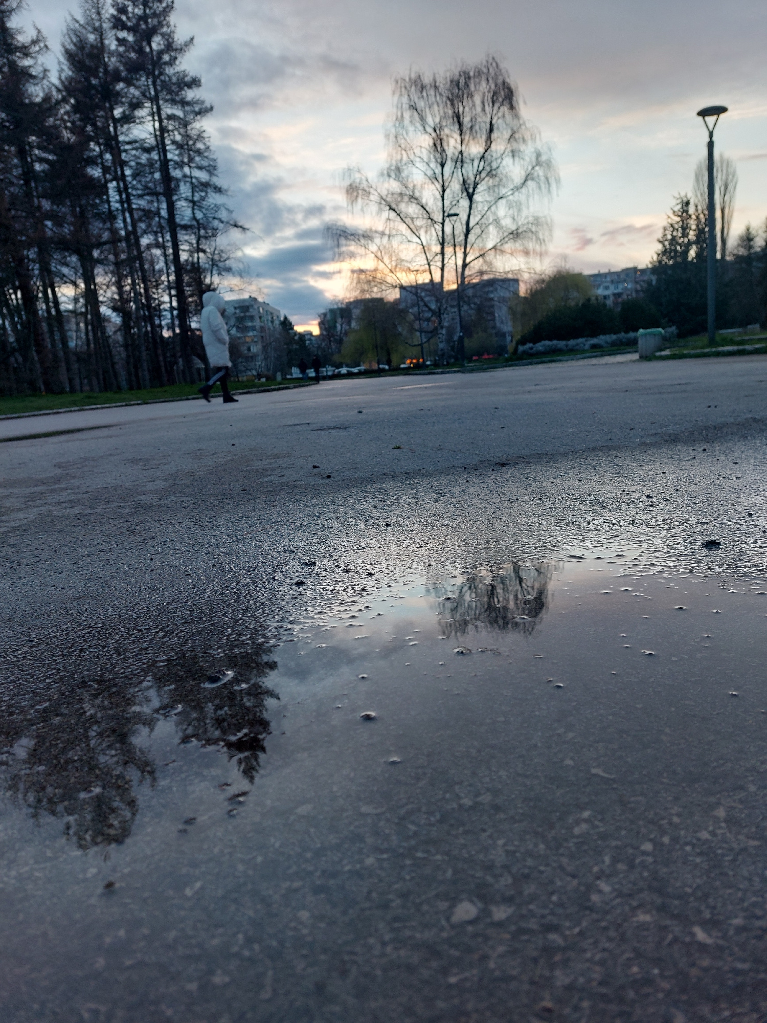 The image captures a wet asphalt surface, likely a road or sidewalk, reflecting the sky and surrounding environment. The reflection shows a sunset or sunrise with clouds, trees, and buildings. In theβ¦read more