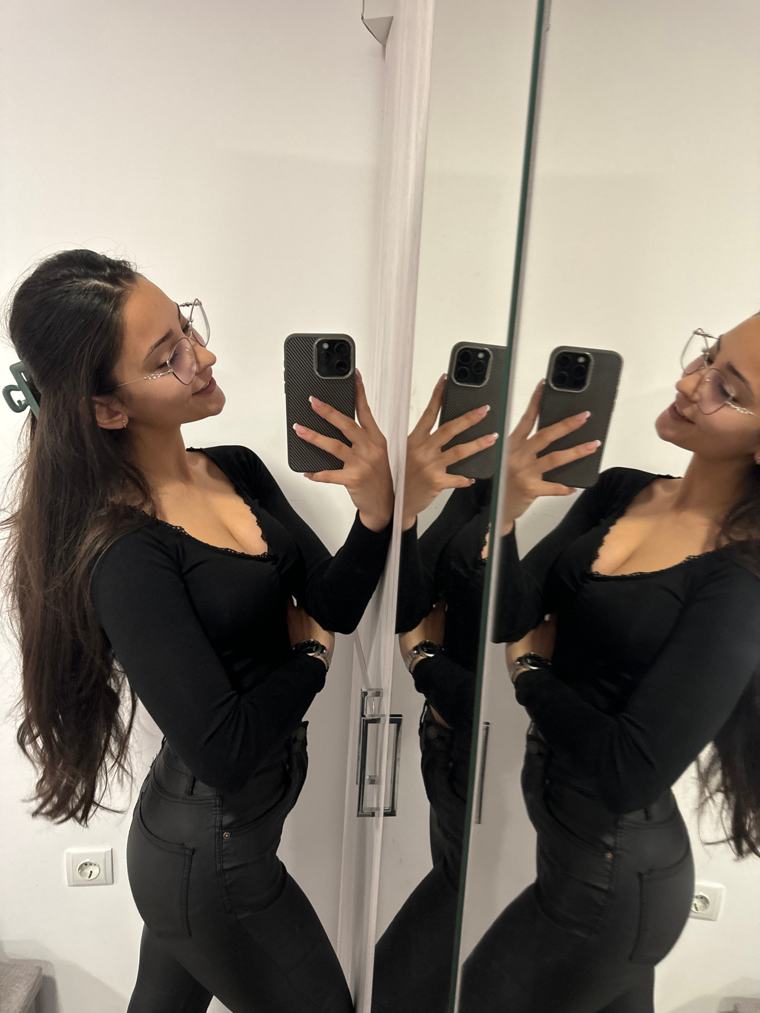 A woman is taking a selfie in front of a mirror. She is wearing glasses, a black long-sleeved top with lace detailing, and tight black pants. She is holding a smartphone with a dark-colored case. Her…read more