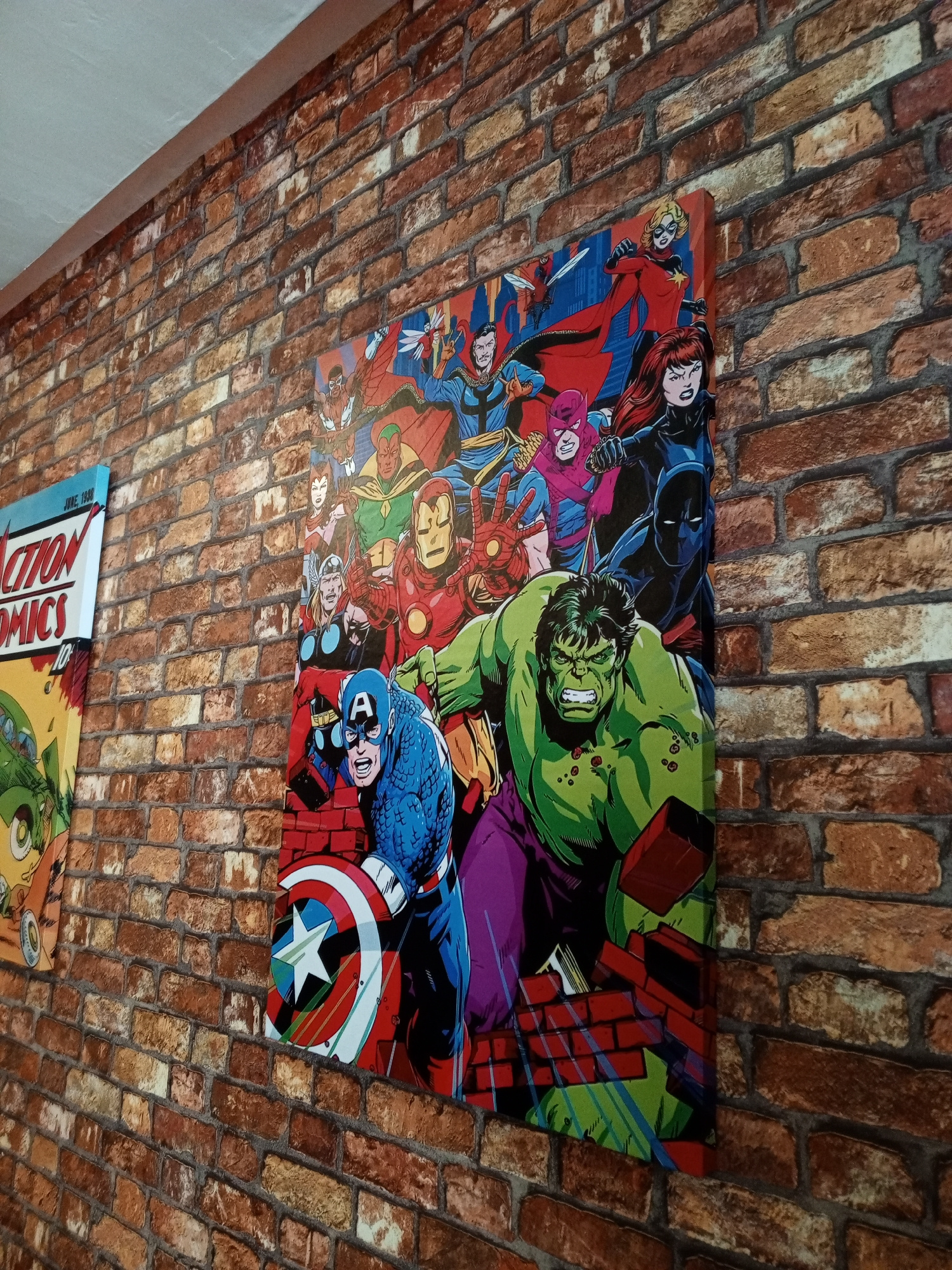 The image shows two framed comic book covers mounted on a brick wall. The rightmost frame depicts various Marvel superheroes, including Captain America, the Hulk, Black Panther, and others. The leftmo…read more