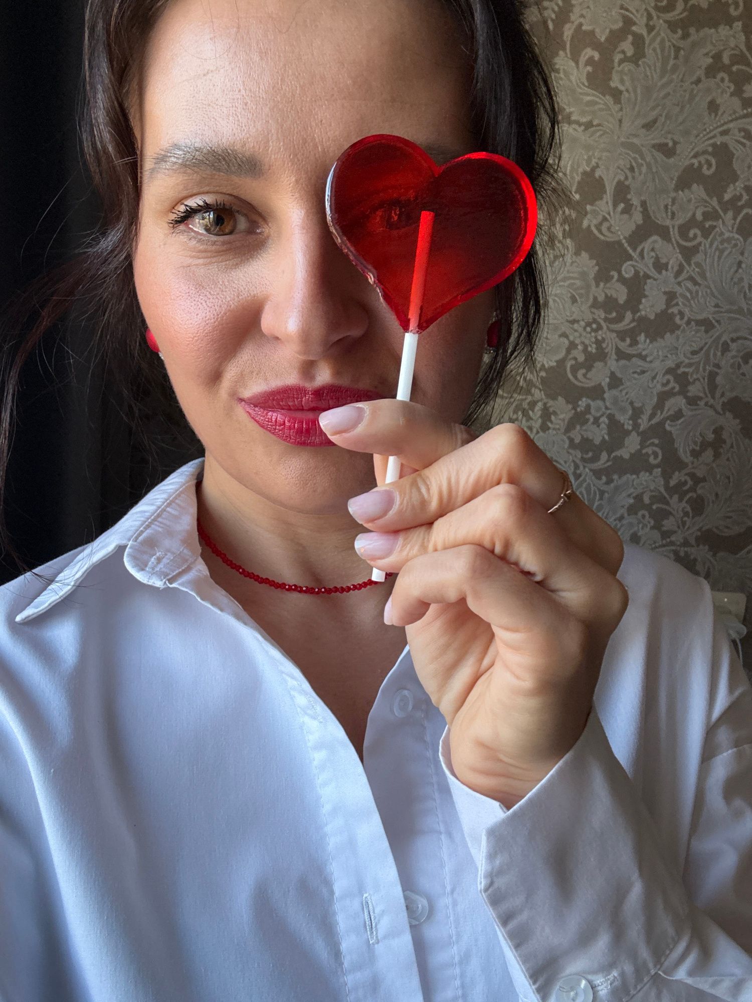 A woman with brunette hair is pictured from the chest up, rotated 90 degrees counterclockwise. She is wearing a white button-down shirt and a thin red beaded necklace. She is holding a red heart-shape…read more