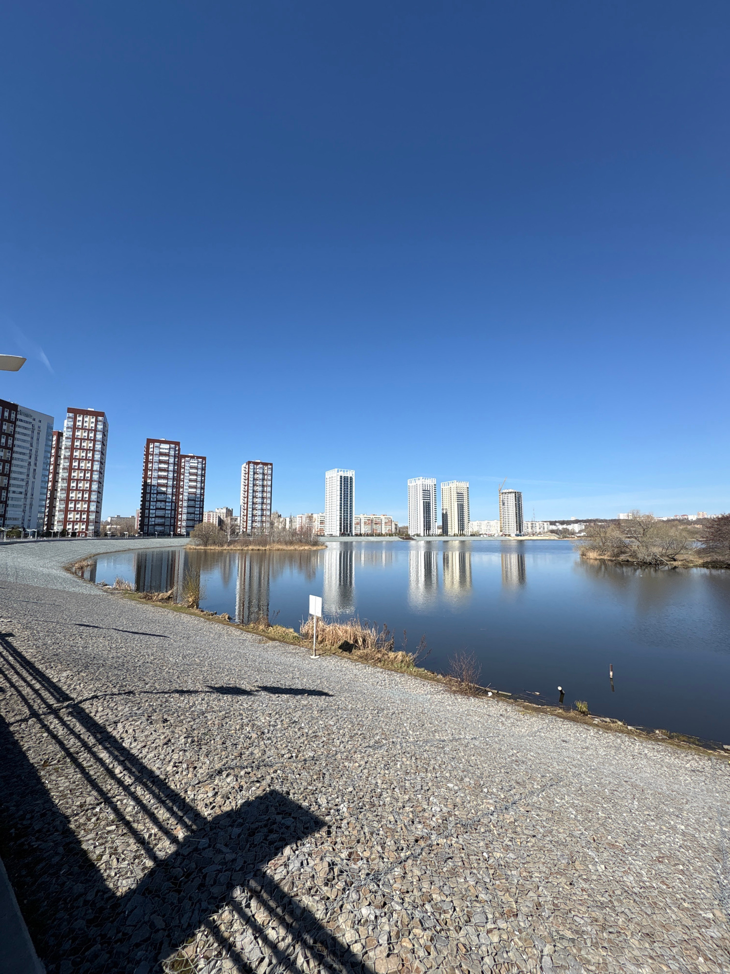A tilted, wide outdoor shot shows a row of high-rise buildings reflected in a river. The buildings are mostly white or brick-colored. The water is calm with a slight ripple effect. The sky is a clear,…read more