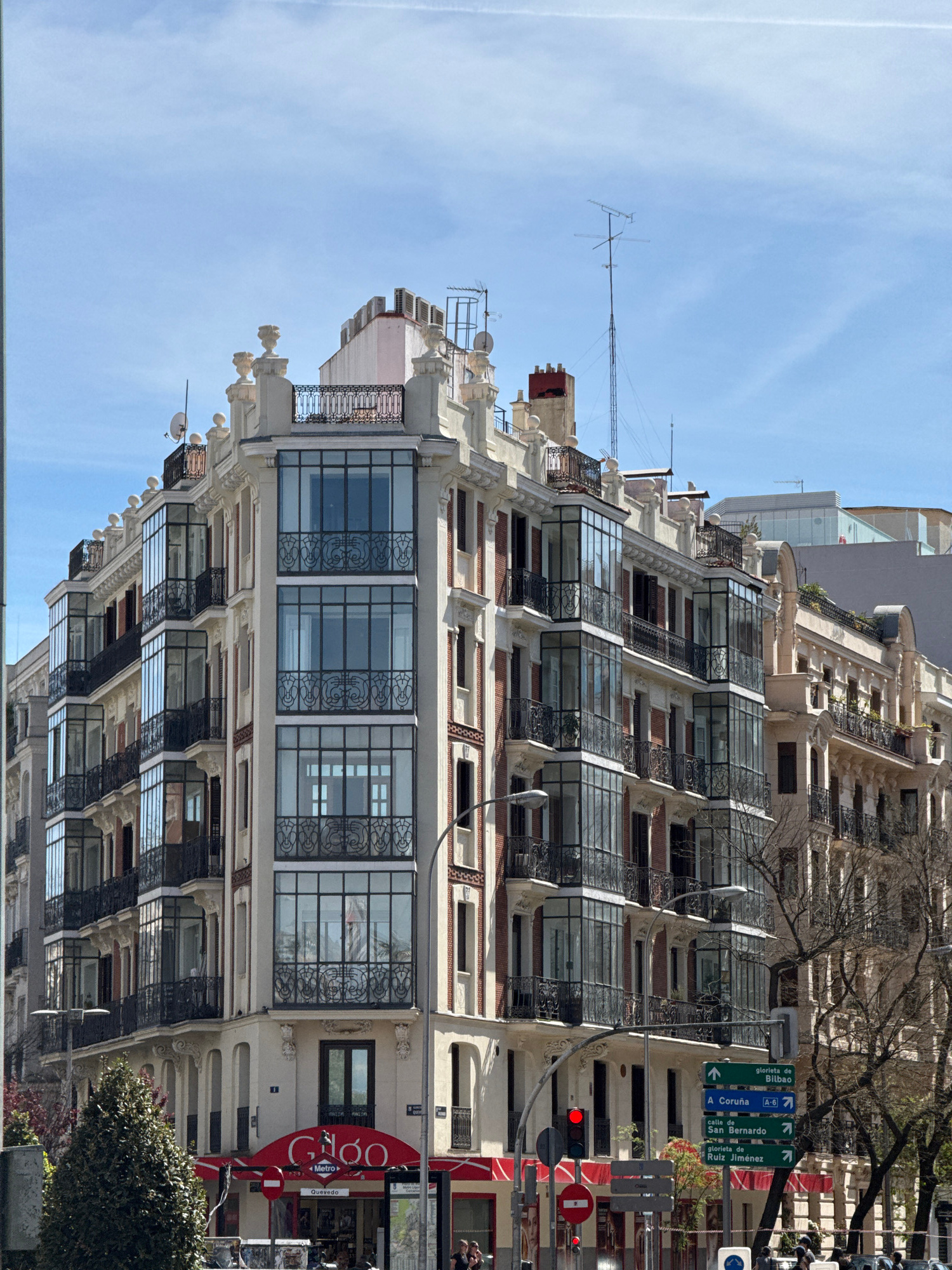 The photograph presents an urban scene in Madrid, Spain, focusing on an ornate building featuring a series of enclosed glass balconies and elaborate architectural details. The facade is predominantly…read more
