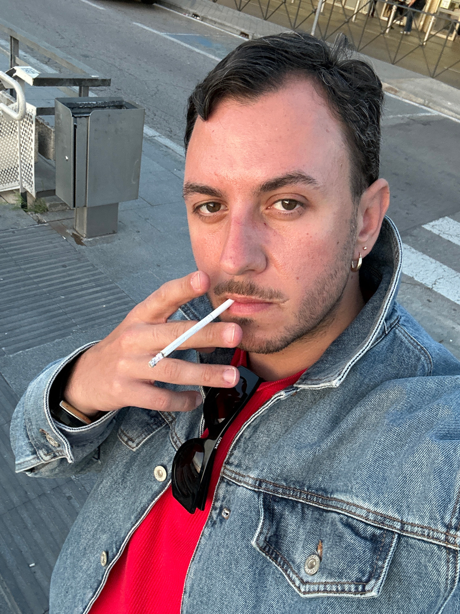 A man is holding a lit cigarette in his right hand. He has short, dark hair and brown eyes. He is wearing a blue denim jacket over a red shirt. A pair of black sunglasses with the brand "Loewe" visibl…read more