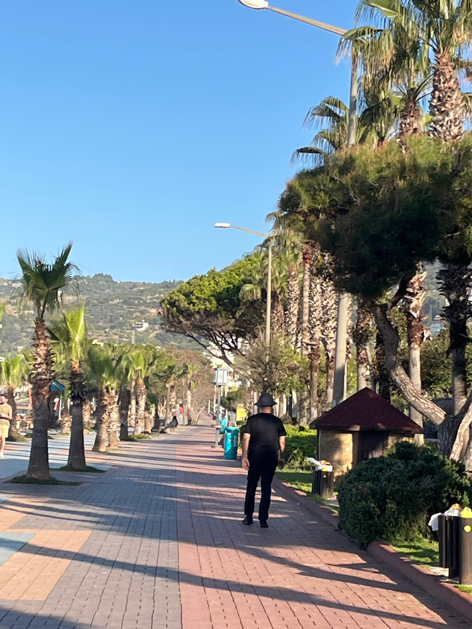 The image shows a street in Alanya, Turkey, lined with palm trees on both sides. A man dressed in black is walking along a brick-paved sidewalk. A small structure with a slanted roof stands to the sid…read more
