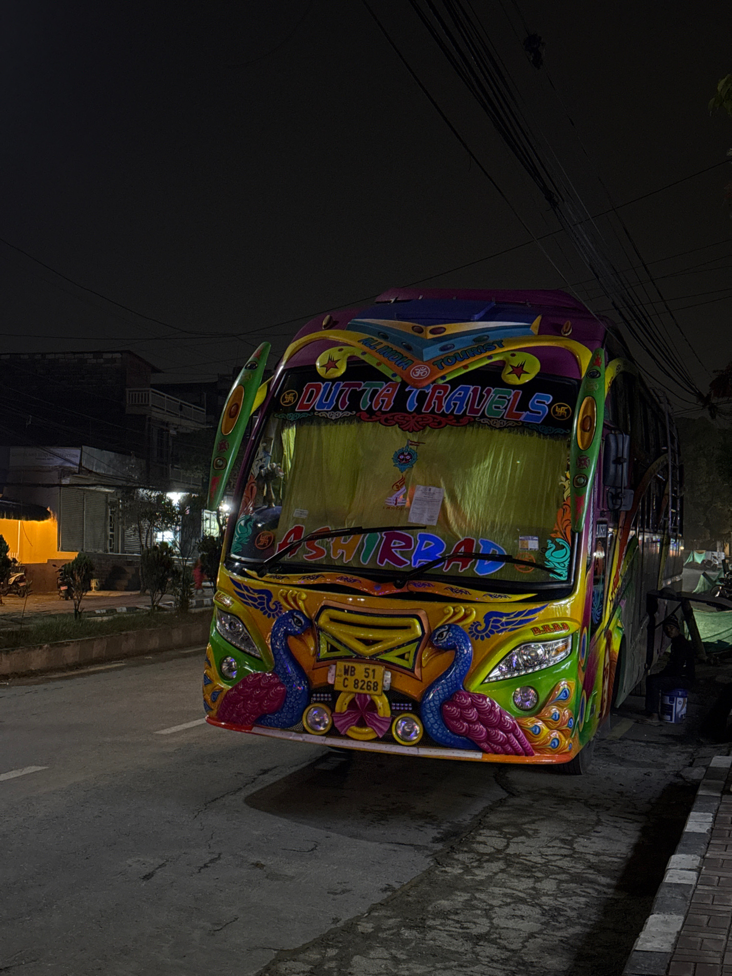 The image shows a brightly decorated bus on a street at night. The bus has the words "DUTTA TRAVELS" and "SHIRABAD" painted on it. The bus is painted with various colors, including yellow, green, purp…read more