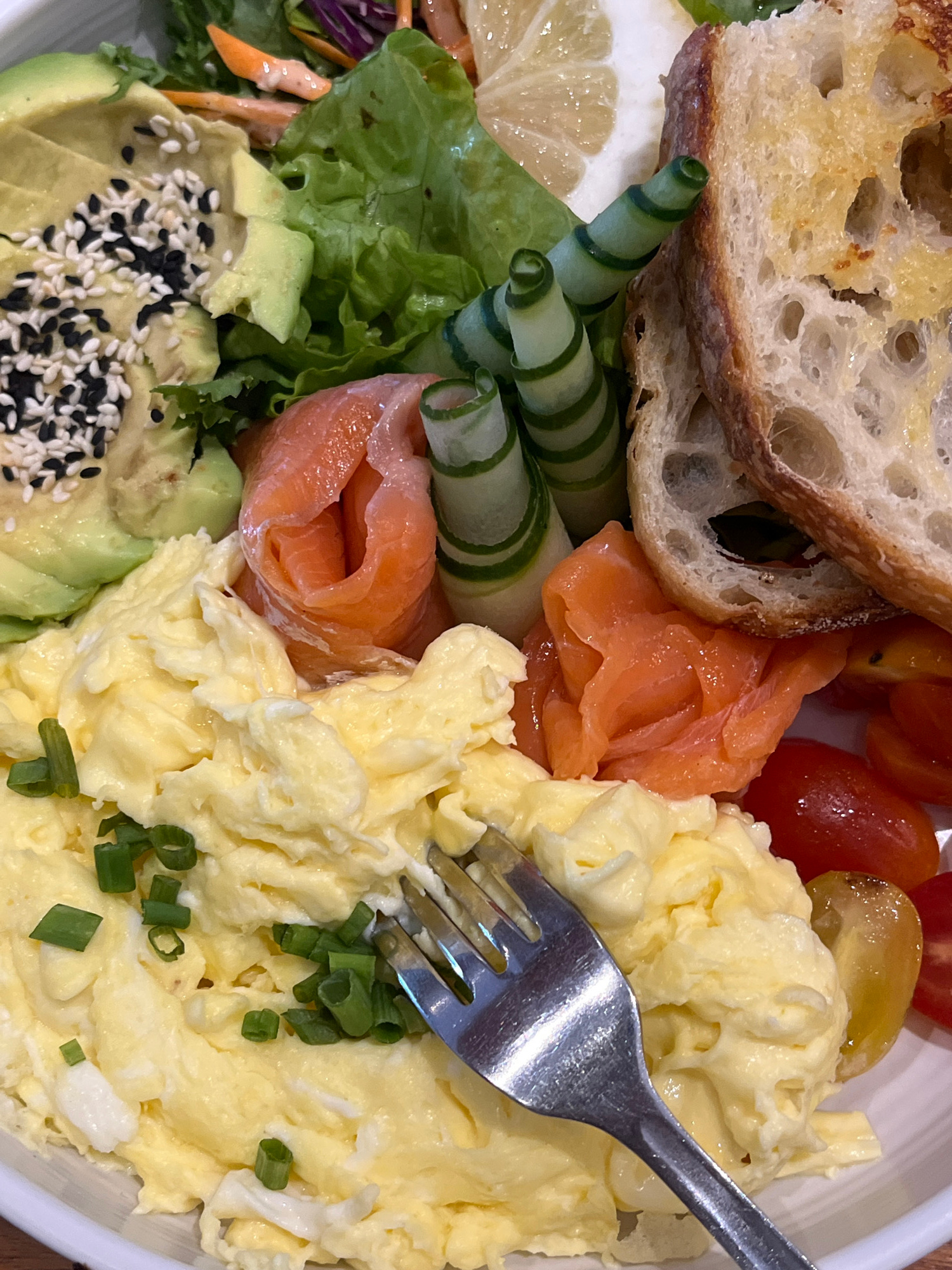 A close-up, overhead shot depicts a plate of food, likely a breakfast or brunch dish. The elements on the plate are arranged in a somewhat sectioned manner. At the top left, there is a piece of toast…read more