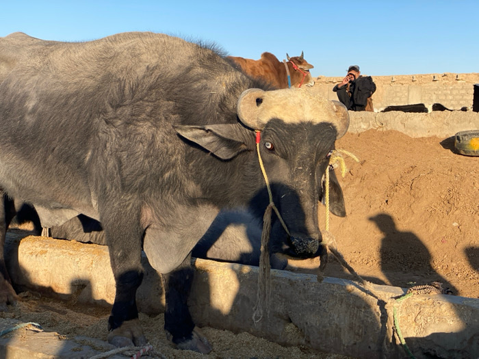 The image depicts an outdoor animal enclosure, specified as being in Jabadar, Afghanistan. In the foreground, a large, dark grey water buffalo with curved horns and a distinct white forehead stands, t…read more