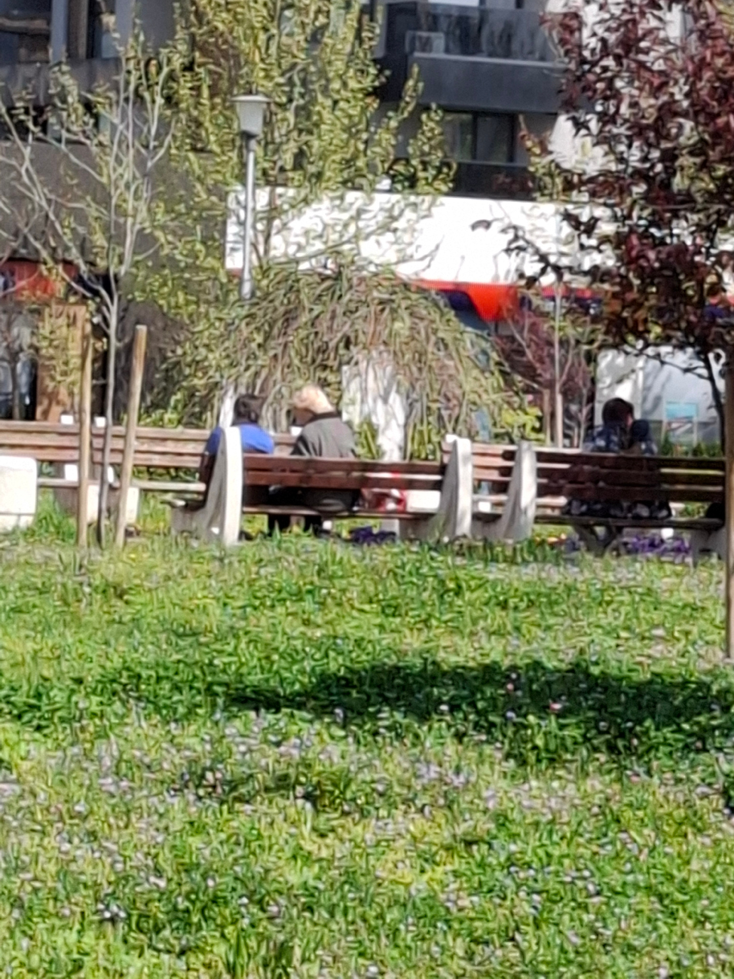 This image captures an outdoor scene, likely an urban park or public green space, on a bright, sunny day. The overall impression is one of leisure and tranquility. The setting is characterized by abu…read more