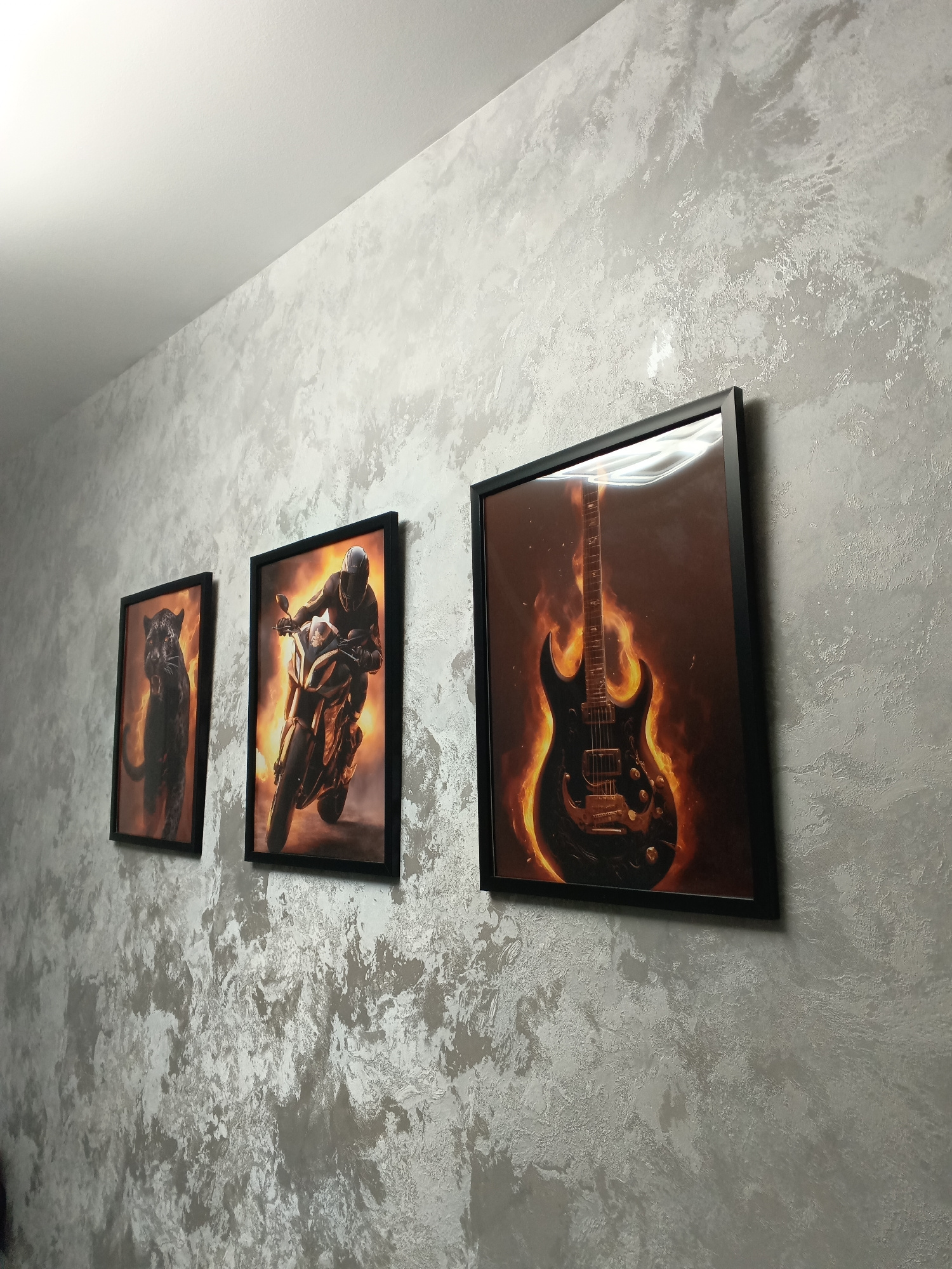 The image displays an interior wall in Andreyevo, Russia, characterized by a highly textured finish, possibly Venetian plaster, in varying shades of grey and silver, creating a mottled, reflective app…read more