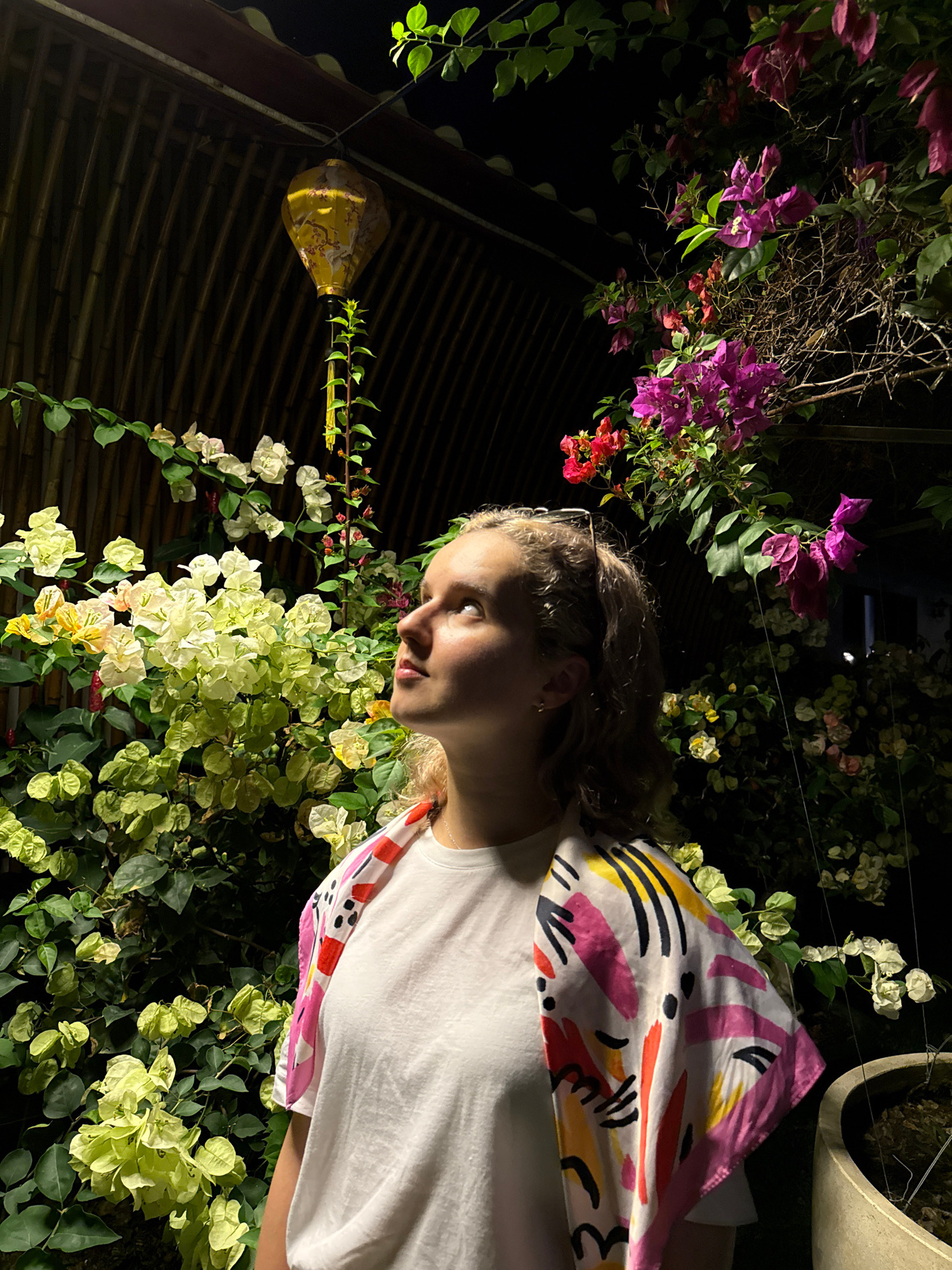 The image captures a young woman in Phú Quốc, Vietnam, seemingly at night. She has light skin, curly blond hair, and is wearing a white t-shirt. A patterned scarf or wrap is draped over her shoulder.…read more