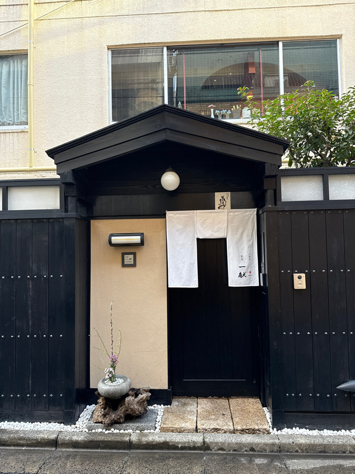 A traditional Japanese building facade features black wooden planks. White fabric with Japanese writing hangs above the door. A cream-colored panel displays a small, framed picture and a cylindrical l…read more
