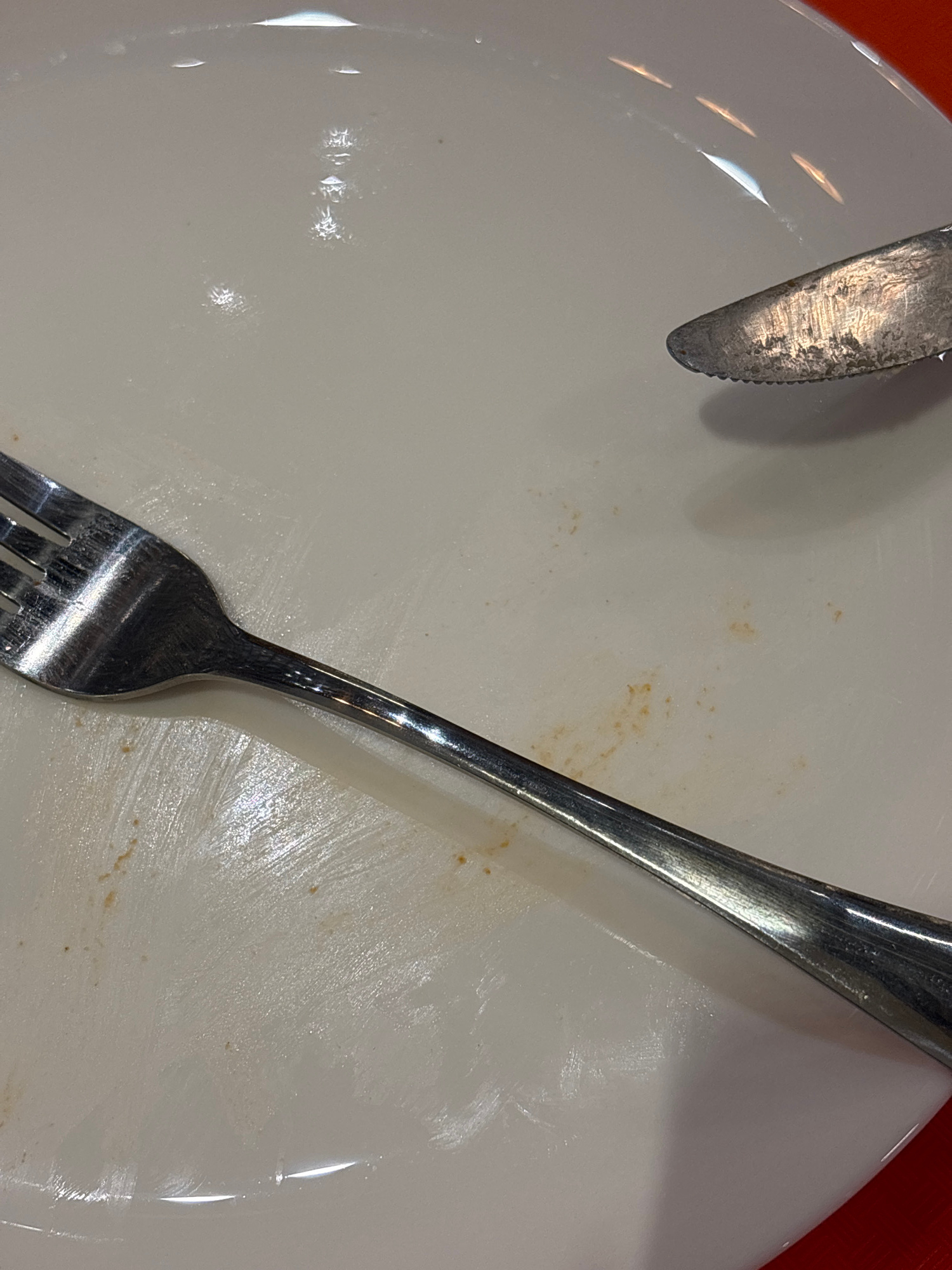 A top-down view of a mostly empty white plate with a knife and fork resting on it. The knife is positioned at the top left and the fork at the bottom right, both angled. The plate appears to have some…read more
