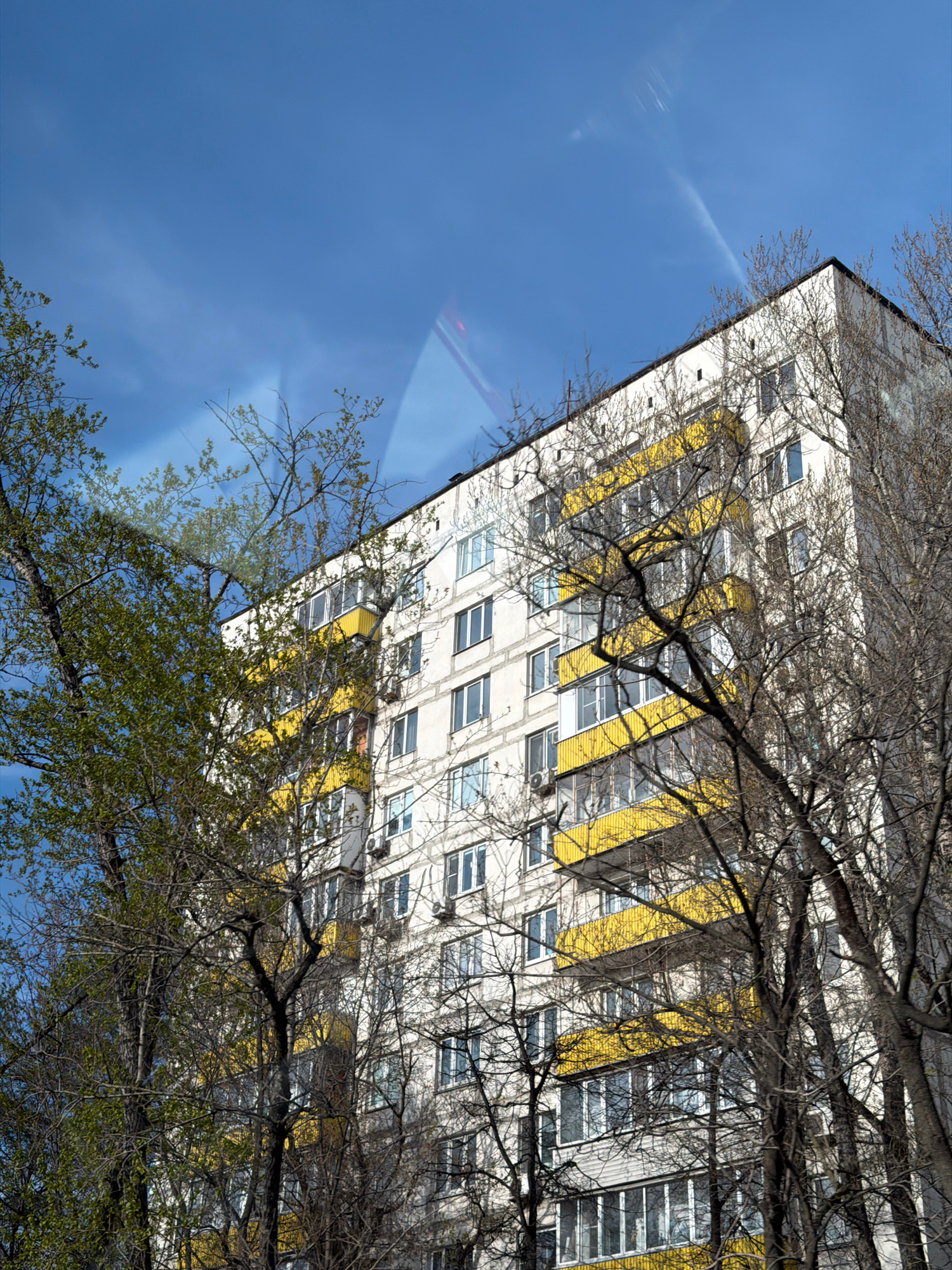 The image captures a diagonal view of a tall, multi-story building seen through a network of tree branches, set against a bright blue sky. The building features a predominantly white or light-colored…read more