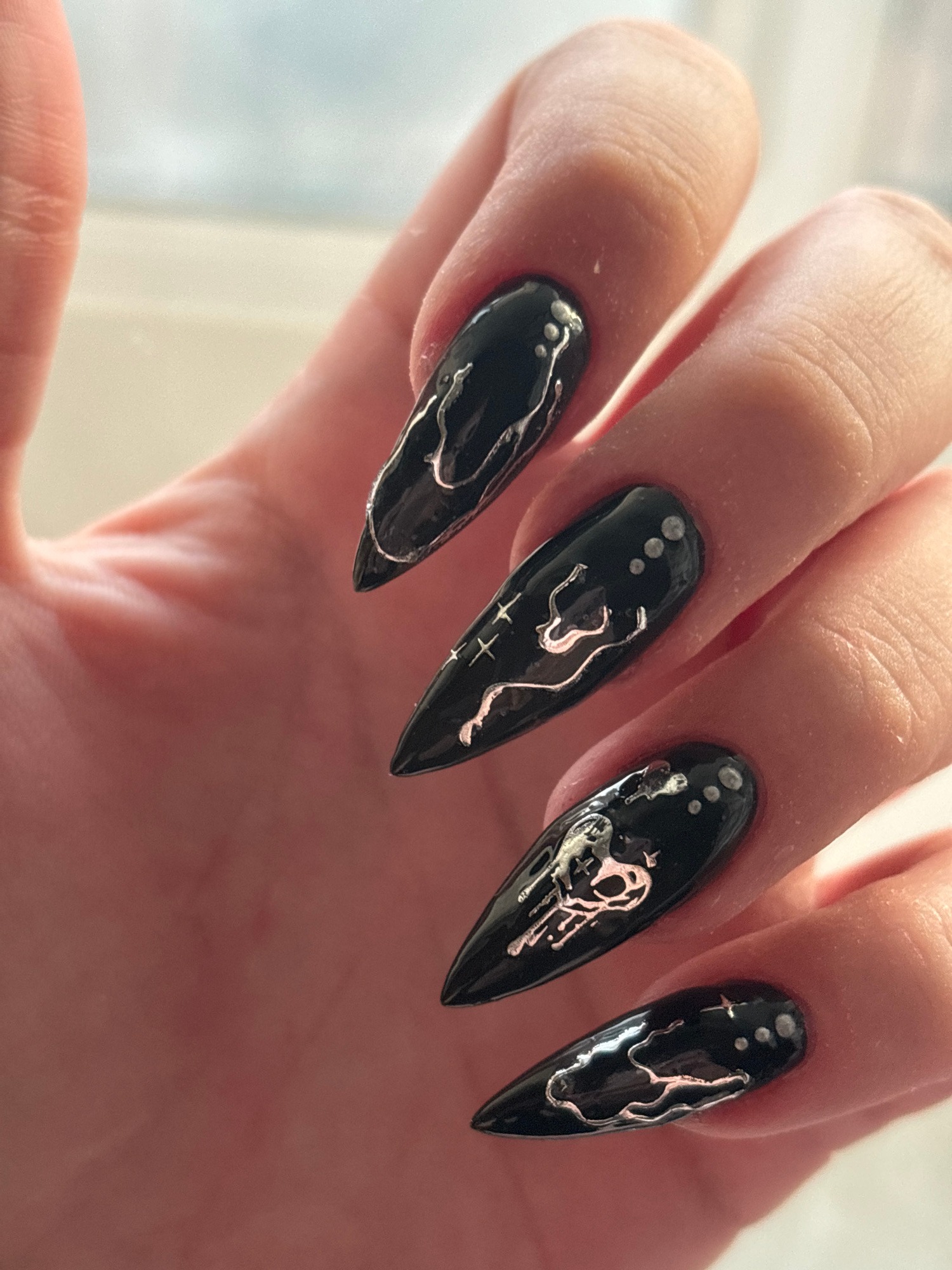 A close-up shows a hand with five elongated, pointed fingernails painted in glossy black. Each nail features unique silver-colored abstract designs and small dots near the cuticle. The ring fingernail…read more