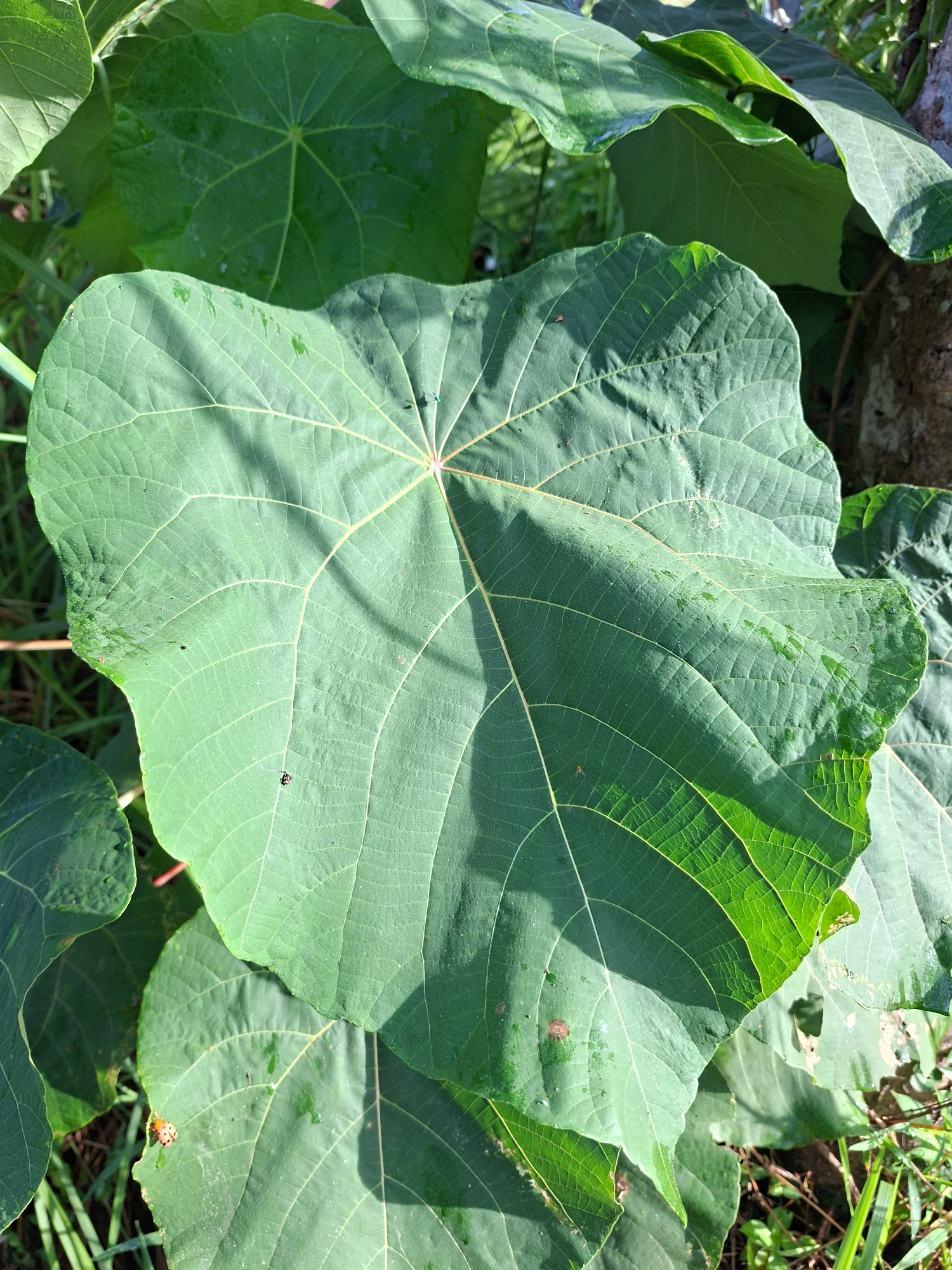 The image shows a close-up view of several large, green leaves with prominent veins. The leaves are the primary focus, and they appear healthy and vibrant. Some leaves show the effects of sunlight cre…read more
