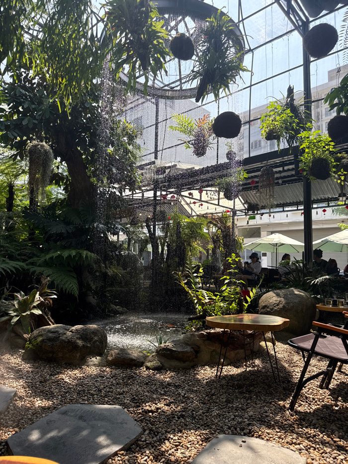 This image depicts a lush, semi-enclosed tropical garden cafe located at Wonderlust Garden & Coffee, 190 Trần Phú, Phước Ninh, Hải Châu, Đà Nẵng, Vietnam. The scene features a high glass ceiling and walls supported by a black metal framework, allowing ample natural light. A prominent artificial waterfall or rain curtain descends from the ceiling into a central, shallow koi pond visible in the mid-ground, creating a mist and splashing effect. The pond contains visible orange-colored fish and is bordered by large, smooth, dark grey rocks. The ground throughout the cafe area is covered with light-colored gravel, interspersed with larger, irregular grey stepping stones. Abundant tropical vegetation fills the space, including large trees with dense green foliage, various ferns, bromeliads, and spherical hanging plants (kokedama style) suspended from the ceiling and structural beams. In the mid-ground, a low, circular coffee table with a natural wood top and thin black metal legs stands on the gravel. To its right, a dark, collapsible outdoor chair is partially visible. Further in the background, under an open-air section of the cafe, several patrons are seated at tables shaded by large white outdoor umbrellas. Individuals are engaged in leisure; one person in a white shirt and dark hat is clearly visible. Red lanterns are strung across the background structure, adding a decorative element. Beyond the cafe's glass structure, taller urban buildings are visible against a bright sky. | Open Wire