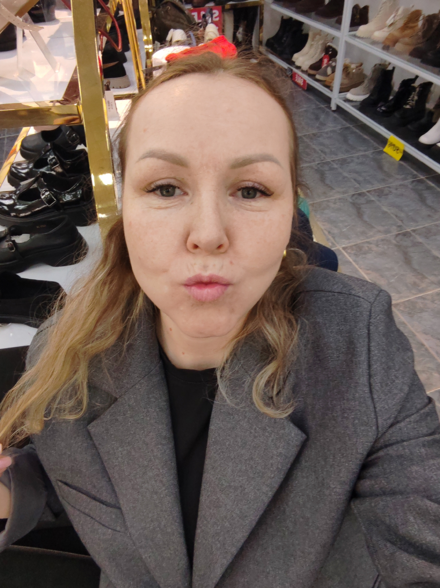 A selfie of a fair-skinned woman with light blonde hair in a gray blazer, standing in a shoe store with multiple shelves of shoes on display. The store appears to be in Chaikovsky, Russia, based on th…read more