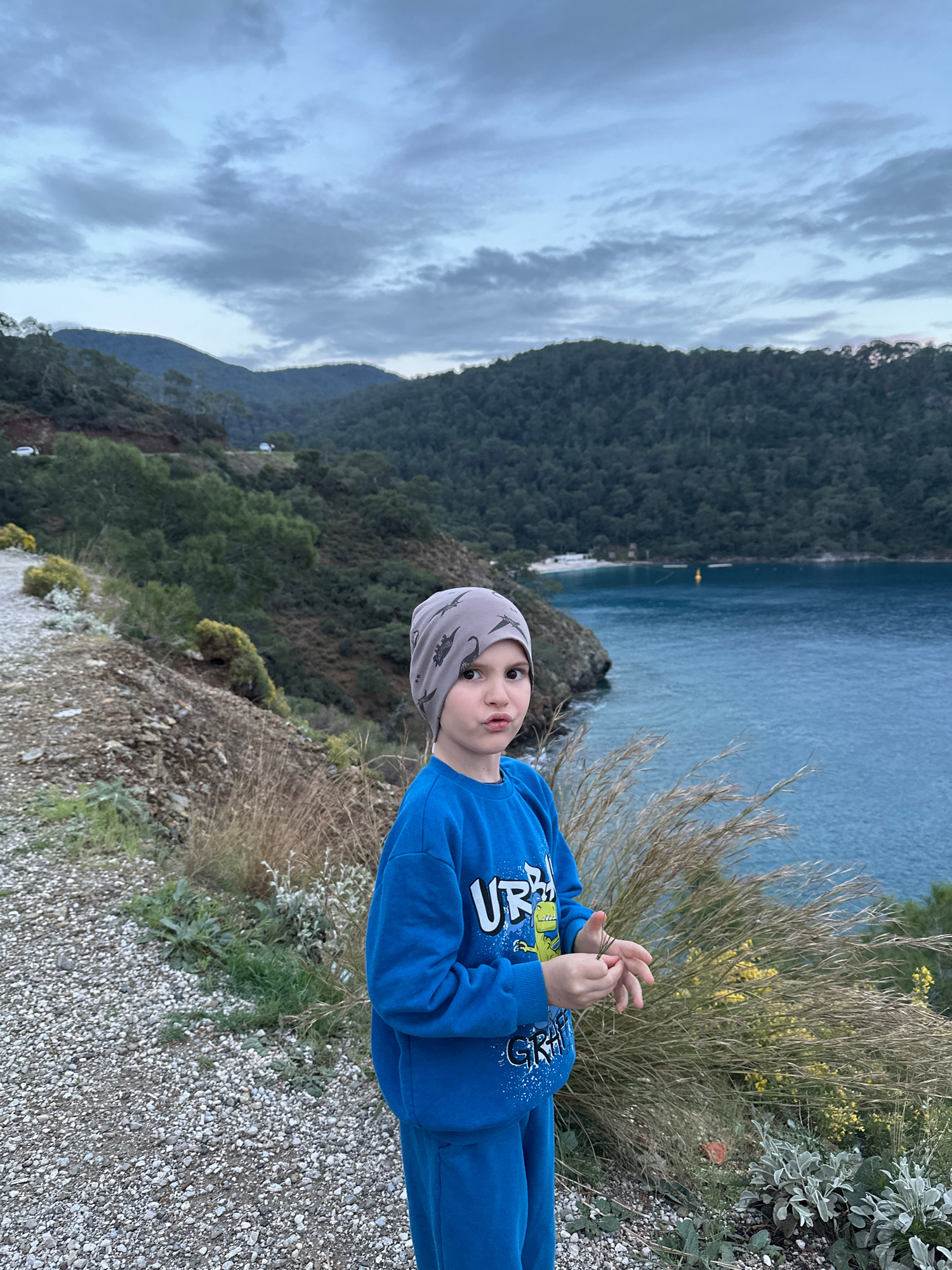 A boy stands on a gravel path overlooking a mountainous coastal landscape in Fethiye, Turkey. The boy is wearing a blue sweatsuit and a gray hat. He is positioned on the right side of the frame, near…read more