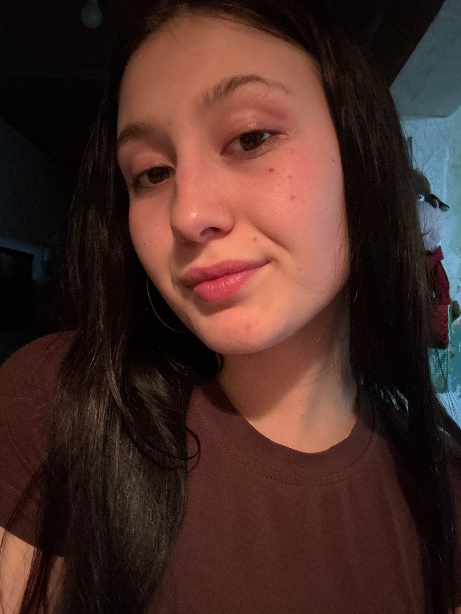 A young person, likely female, with long dark hair, is captured in a close-up, slightly tilted portrait, possibly a selfie. She is looking directly towards the viewer with dark eyes and a soft, slight…read more