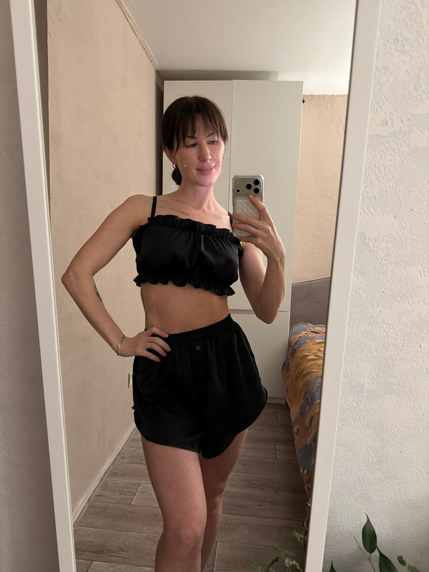 A woman is reflected in a mirror, holding a phone to take a selfie. She is wearing a black, ruffled top and black shorts. The background includes a white cabinet, a wall, wooden flooring, and a plant.…read more