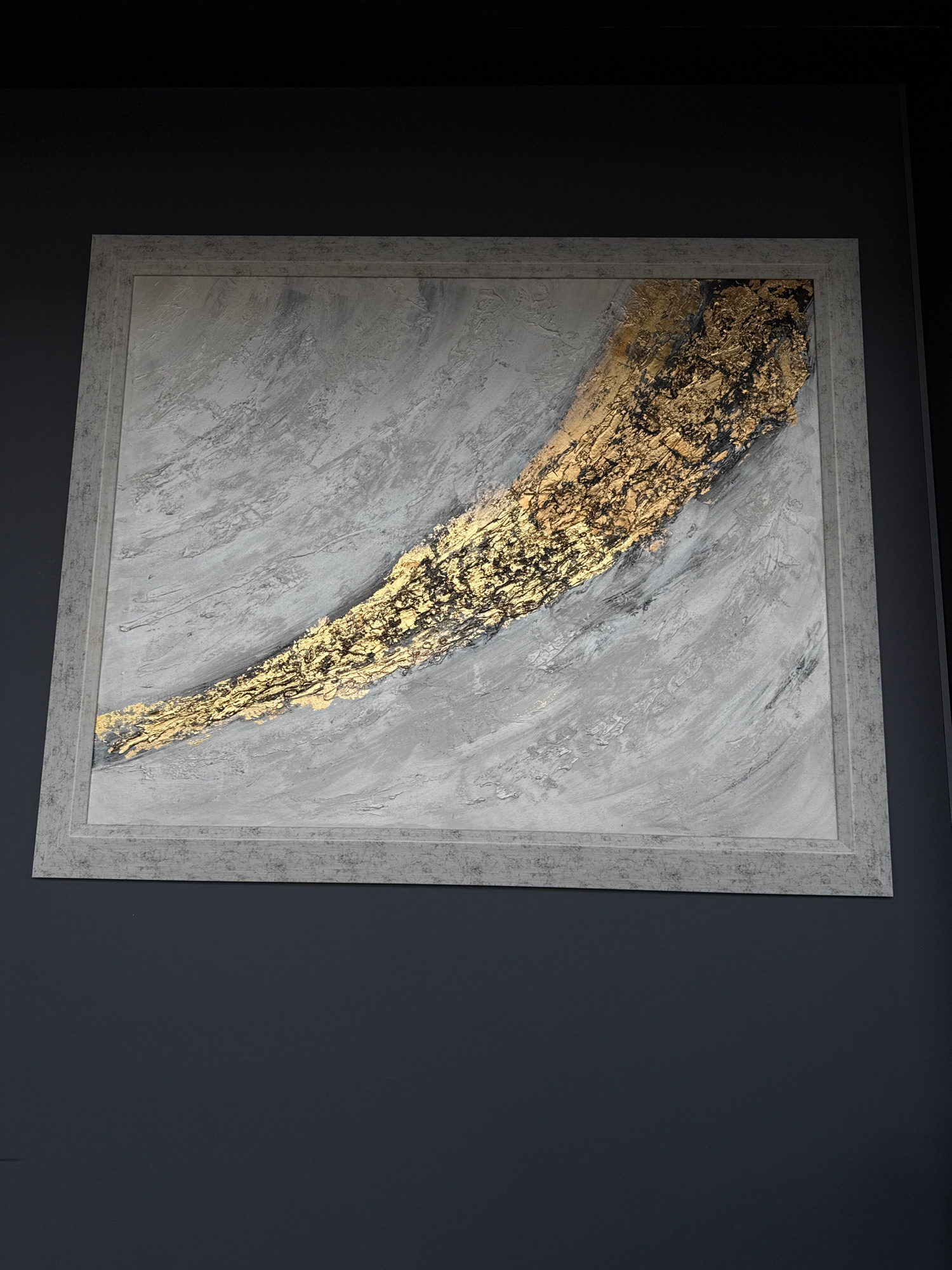 An abstract painting, vertically oriented and framed in light gray, is displayed on a dark, possibly charcoal gray or black wall. The artwork features a prominent, textured, and irregular streak of go…read more