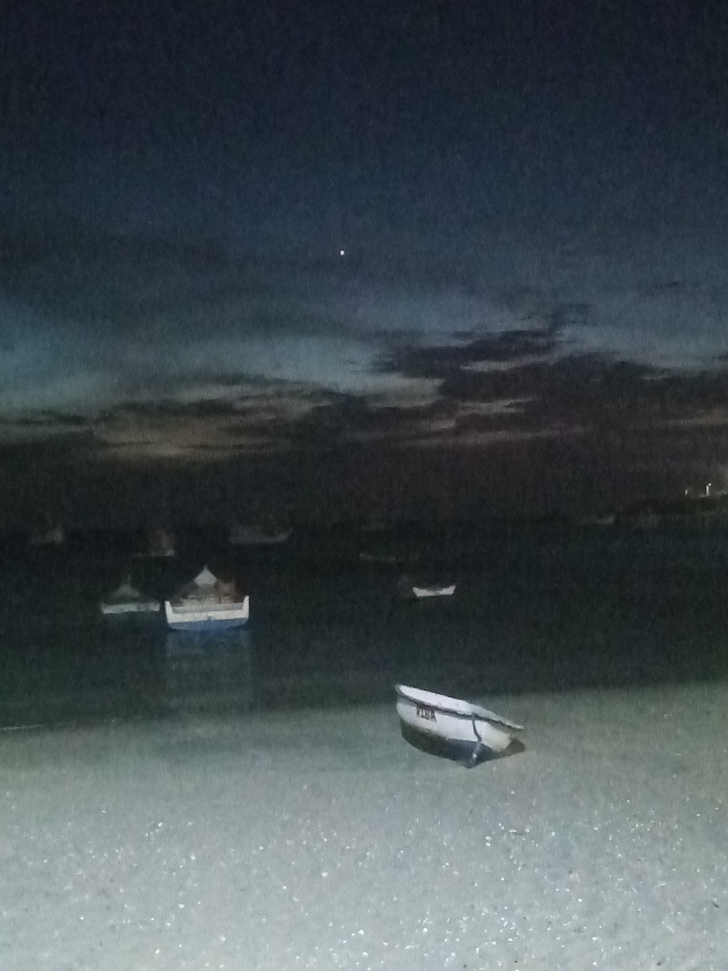 This is a low-light, wide-angle photograph depicting a beach at Juan Griego, Venezuela at night. The sky is dark with scattered clouds and a single visible star. Several small boats are visible, both…read more