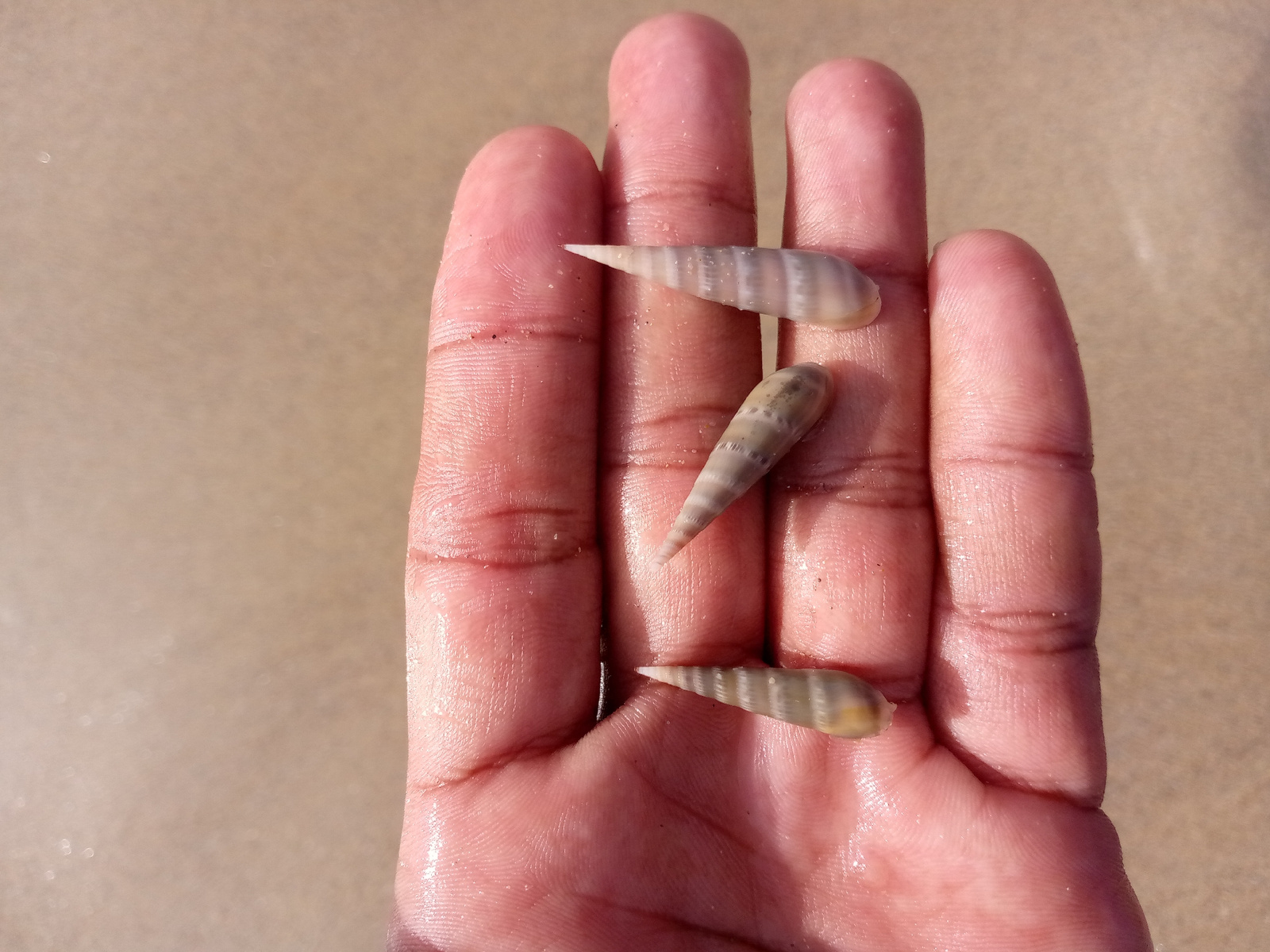 A close-up photograph depicts an open human palm holding three auger shells. The skin of the hand is pinkish-red and appears slightly wet. The shells are elongated, conical, and feature alternating ba…read more