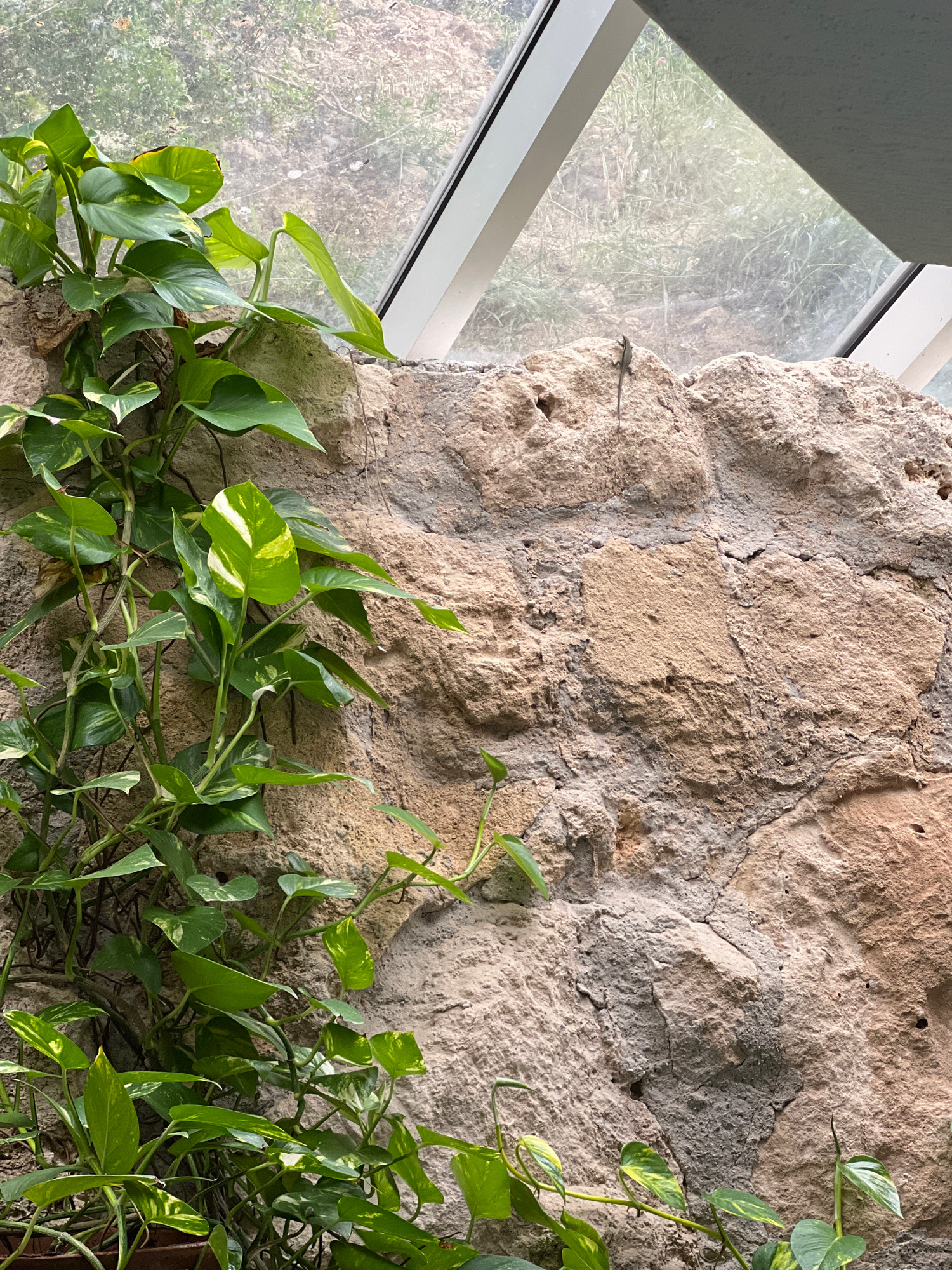 An eye-level shot captures a detailed view of a rustic stone wall, a lush green plant, and a window revealing an outdoor scene. The central focus is a small, slender lizard, likely a gecko or anole, c…read more