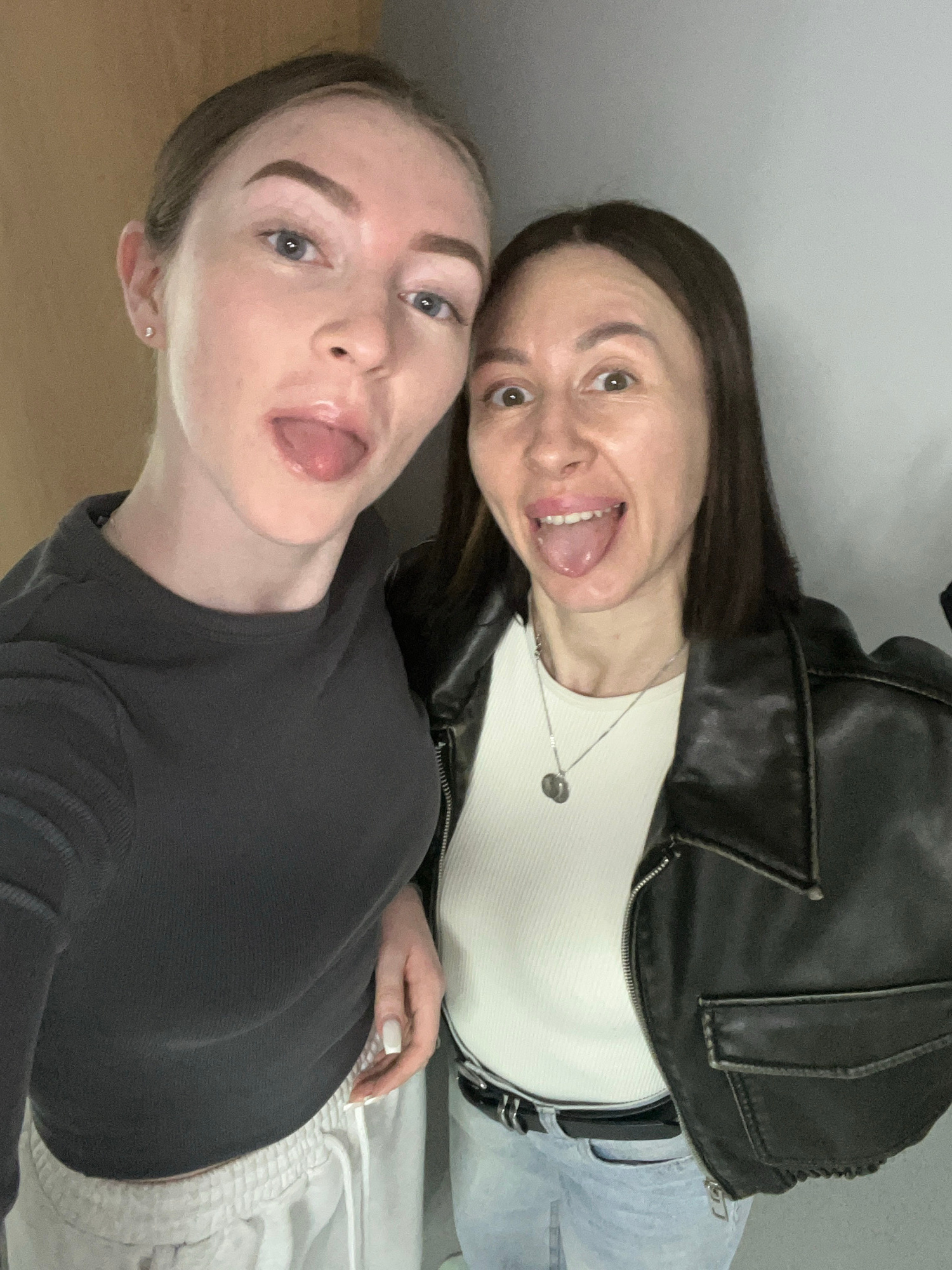 The image is a playful selfie featuring two young women posing indoors. The photo is rotated 90 degrees counter-clockwise, with the women's heads tilted to the right. The woman closer to the camera h…read more