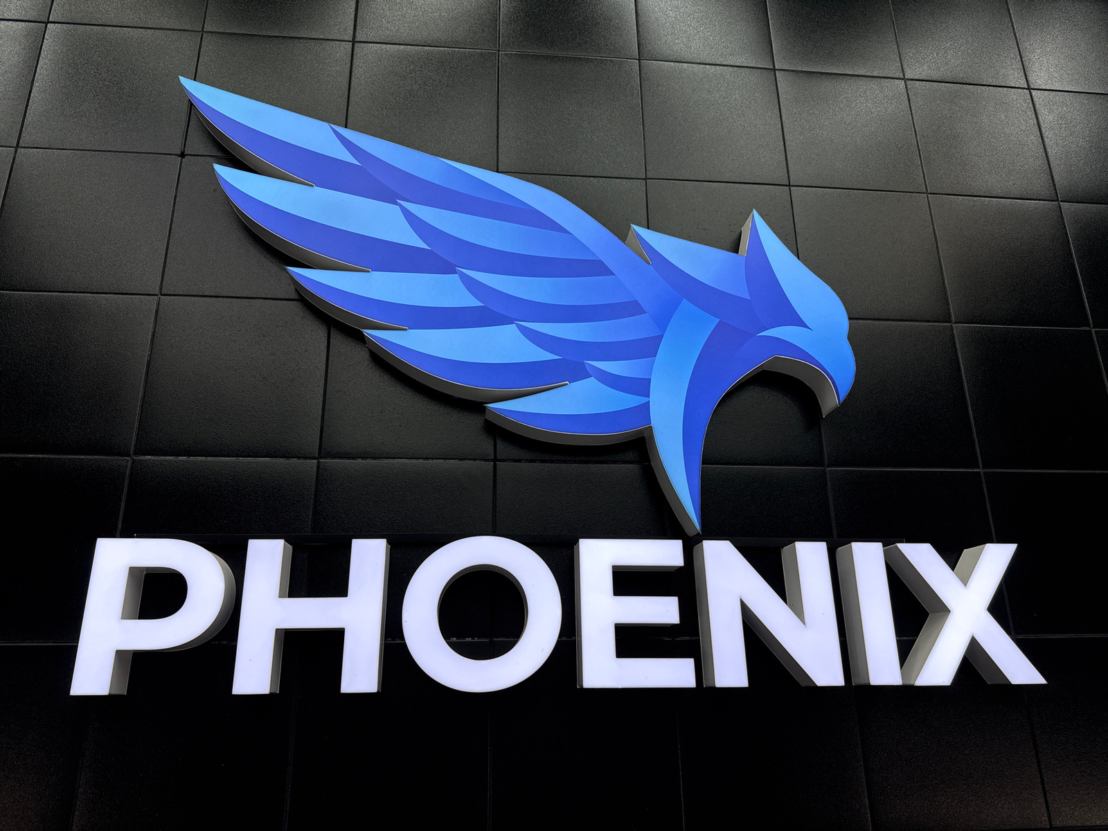 The image shows a wall-mounted sign that reads "PHOENIX" in large, illuminated white block letters. Above the text is a stylized emblem of a phoenix, rendered in shades of blue. The background is a bl…read more