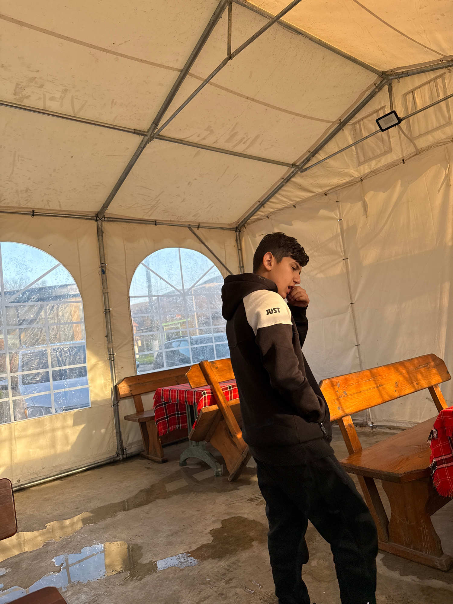 A teenage boy in a black sweatshirt with "JUST" on the sleeve is standing inside a white tent with arched windows. He has his hand near his mouth. A wooden picnic table with a red plaid cushion is vis…read more