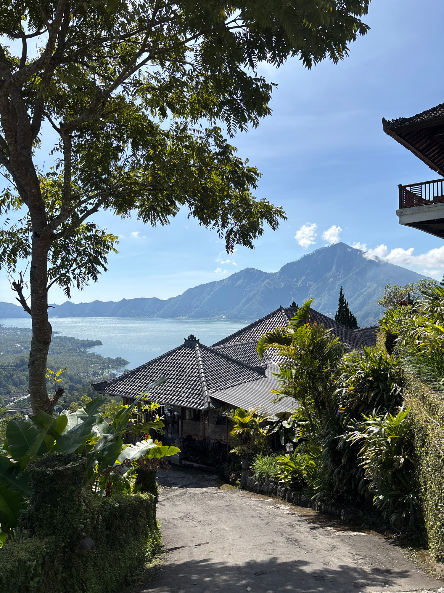 The scene is a daytime shot from Kintamani, Indonesia, featuring a partial view of a lake or large body of water with mountains in the distance. The sky is blue with some scattered white clouds. In th…read more
