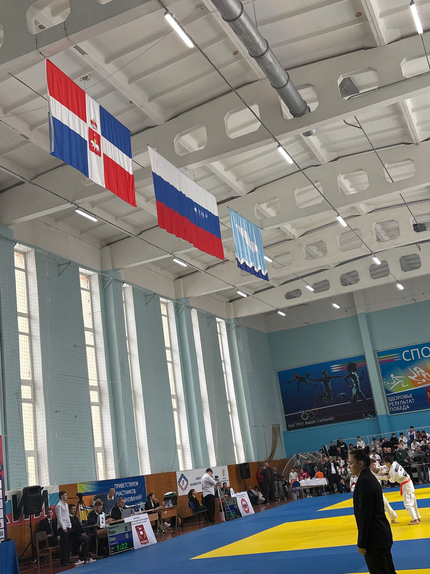 The image shows the interior of a sports hall in Chaikovsky, Russia, identifiable by the presence of the Perm region flag (red and white with a symbol in the center) and the Russian flag (white, blue,…read more