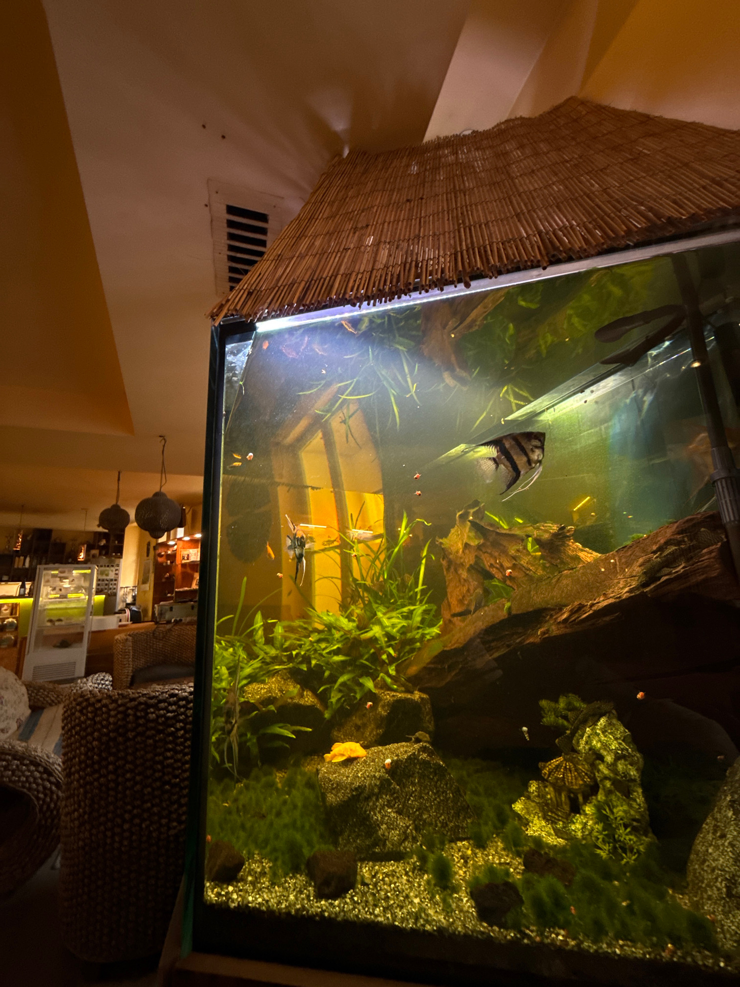 A photograph depicts a freshwater aquarium with a diverse aquatic ecosystem. Fish, including an angelfish and some smaller species, are visible among plants, rocks, and driftwood. The aquarium is posi…read more