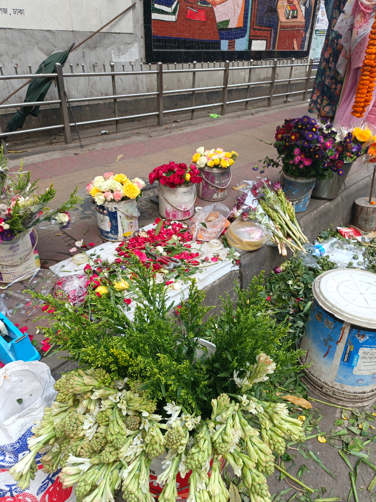 The image depicts a flower stall on a sidewalk in Dhaka, Bangladesh. Buckets filled with flowers in various colors (red, yellow, white, purple) and types (roses, tuberoses) are arranged along the curb…read more