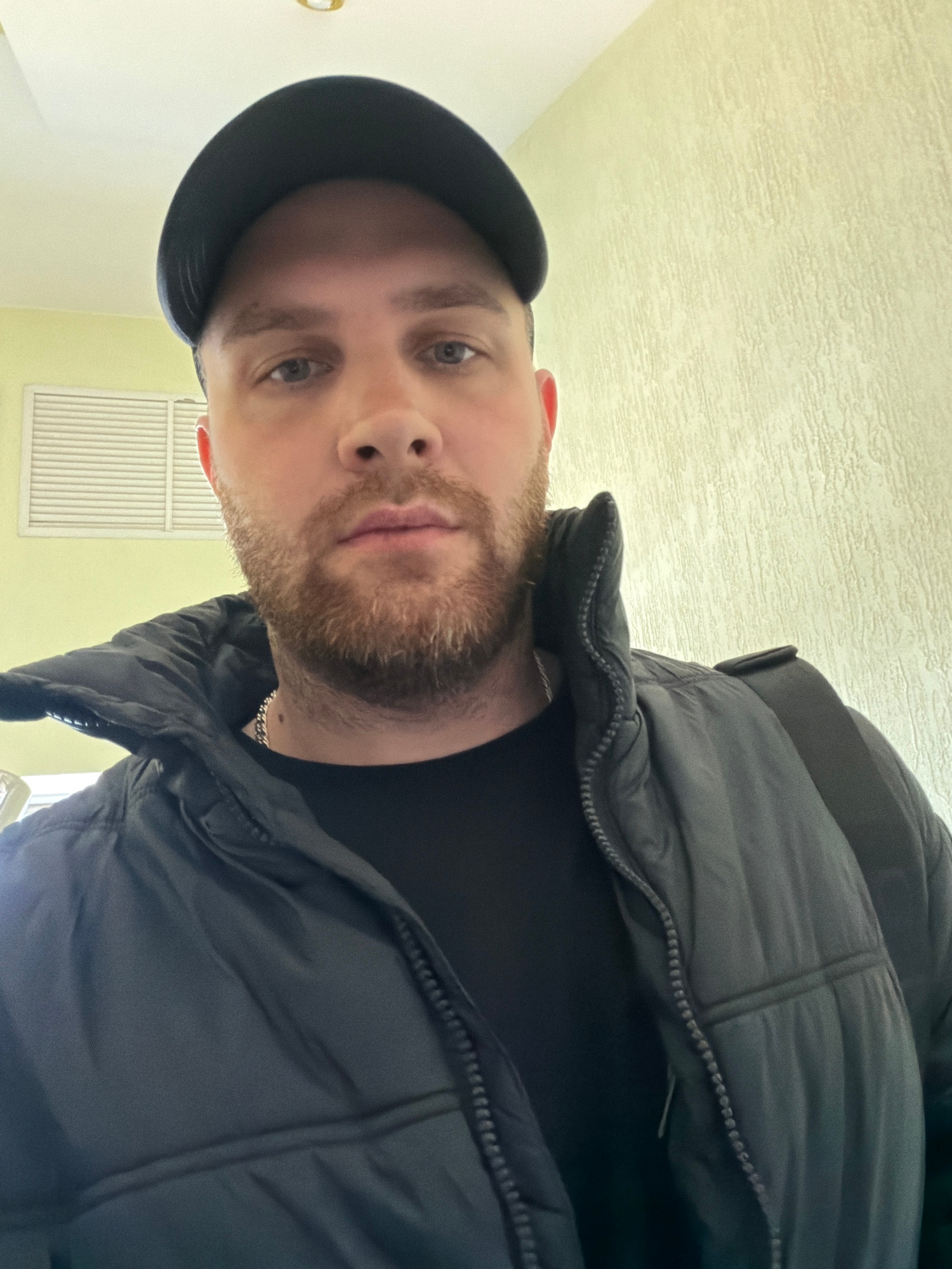 A man with a beard and a black cap is wearing a black puffer jacket and looking down at the camera. He appears to be indoors, with a light yellow wall behind him. A white vent is visible in the lower…read more