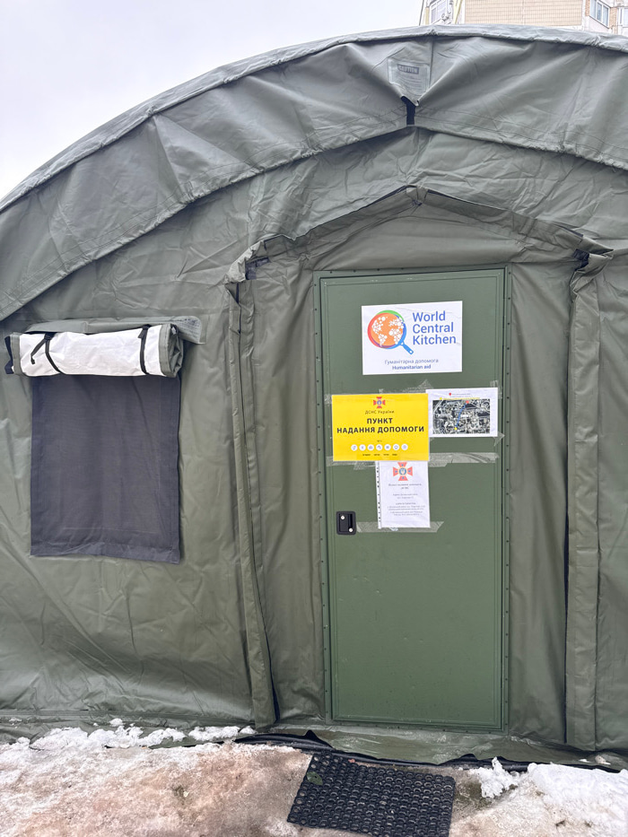 The image displays the exterior of a large, olive-drab green canvas tent, functioning as a humanitarian aid point in the city of Kyiv, Ukraine. A solid, olive-drab green metal door is centered on the…read more