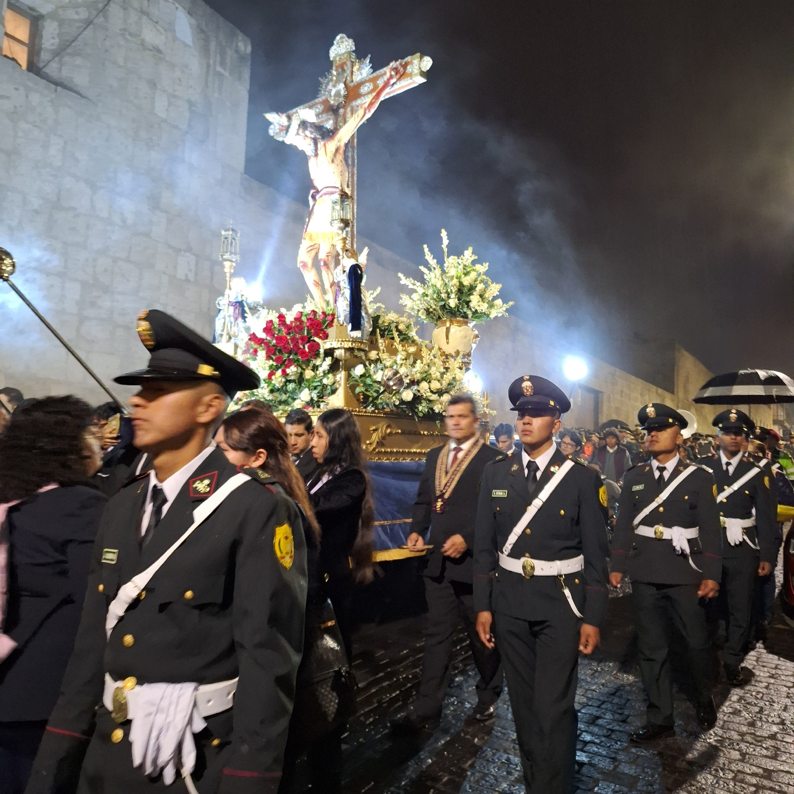 A nighttime religious procession in Arequipa, Peru is underway, likely during Holy Week. A crucifix adorned with lights, flowers, and an ornate cloth is being carried by unseen individuals. Smoke or fâŚread more