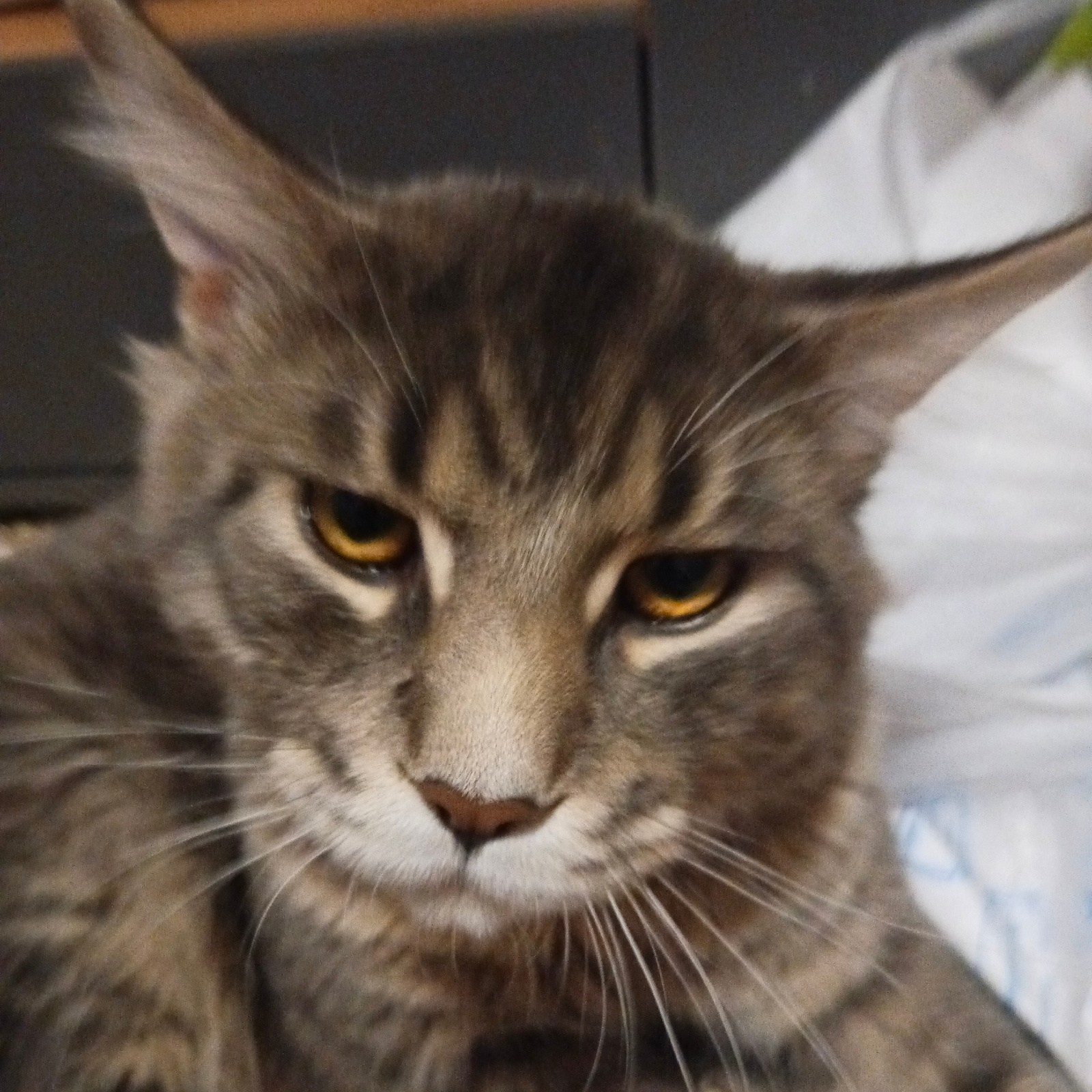 A close-up, high-angle shot features a tabby cat. The cat's fur is primarily brown and gray with darker stripes. Its eyes are amber-colored. The background is blurred, showing a dark object on the lef…read more