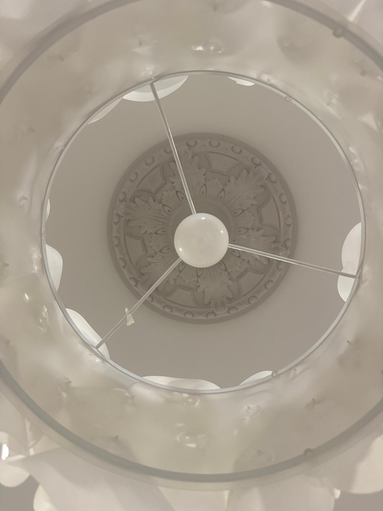 The image presents an upward-looking view into a ceiling light fixture, set in an indoor environment. A prominent white, translucent lampshade, possibly cylindrical or slightly conical, frames the cen…read more