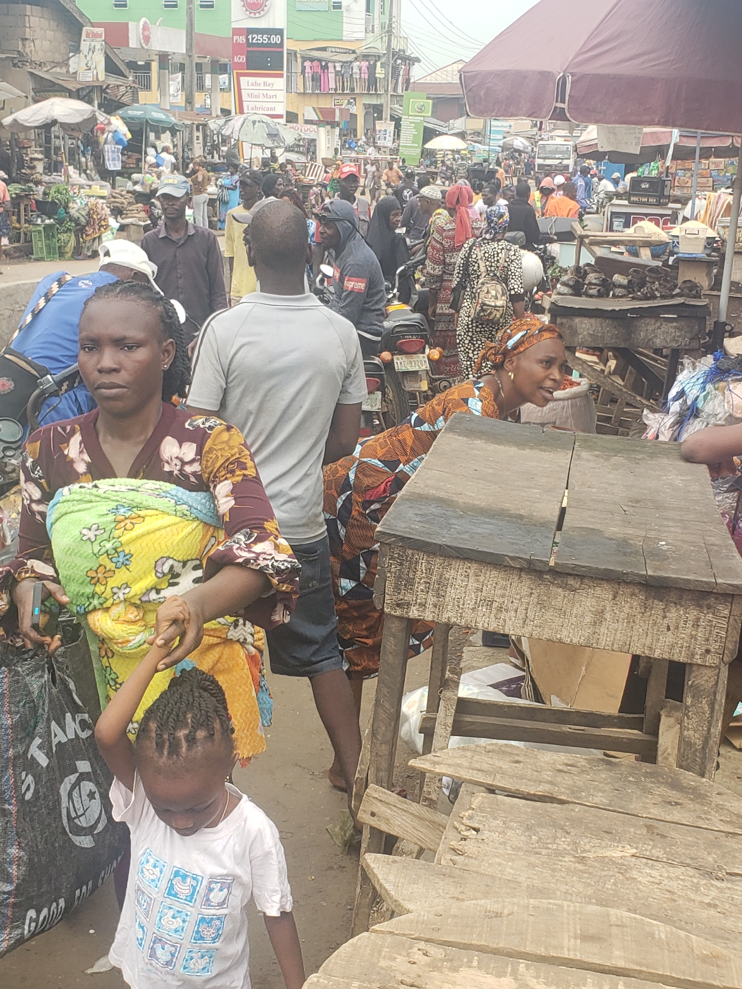 The image captures a vibrant, busy outdoor market scene in Apataganga, Nigeria, presented with a 90-degree counter-clockwise rotation. When viewed upright, the scene depicts a bustling street market d…read more