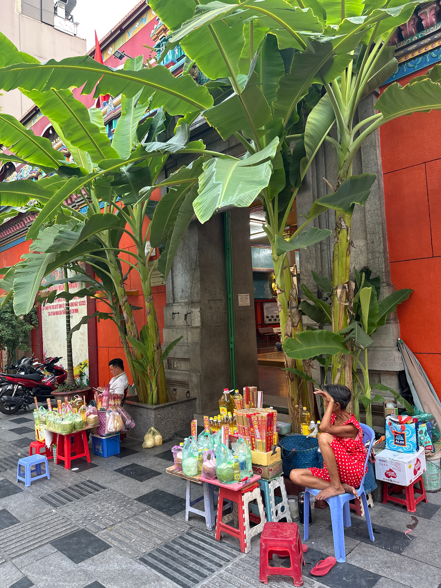 In Thủ Đức, Vietnam, a daytime street scene shows a woman in a red polka dot dress sitting on a blue plastic chair, appearing to be resting her head in her hand. She is next to a small makeshift marke…read more