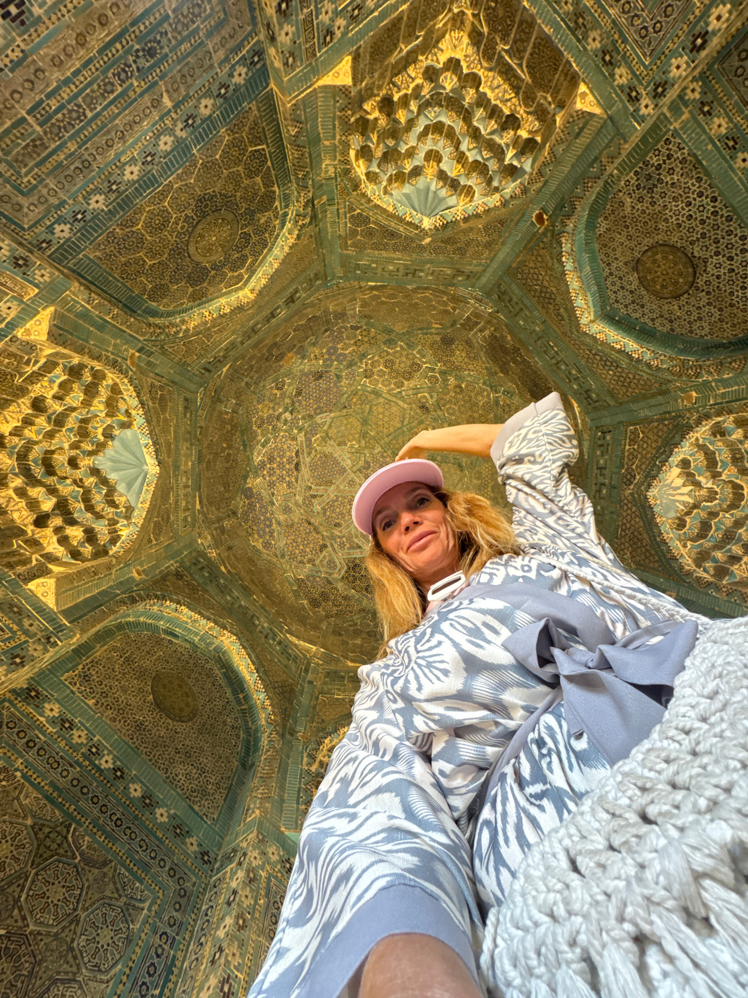 A low-angle shot shows a woman in the lower right foreground, against a highly decorated ceiling. The woman has blonde hair and wears a light pink cap. She is dressed in a patterned light grey and whi…read more