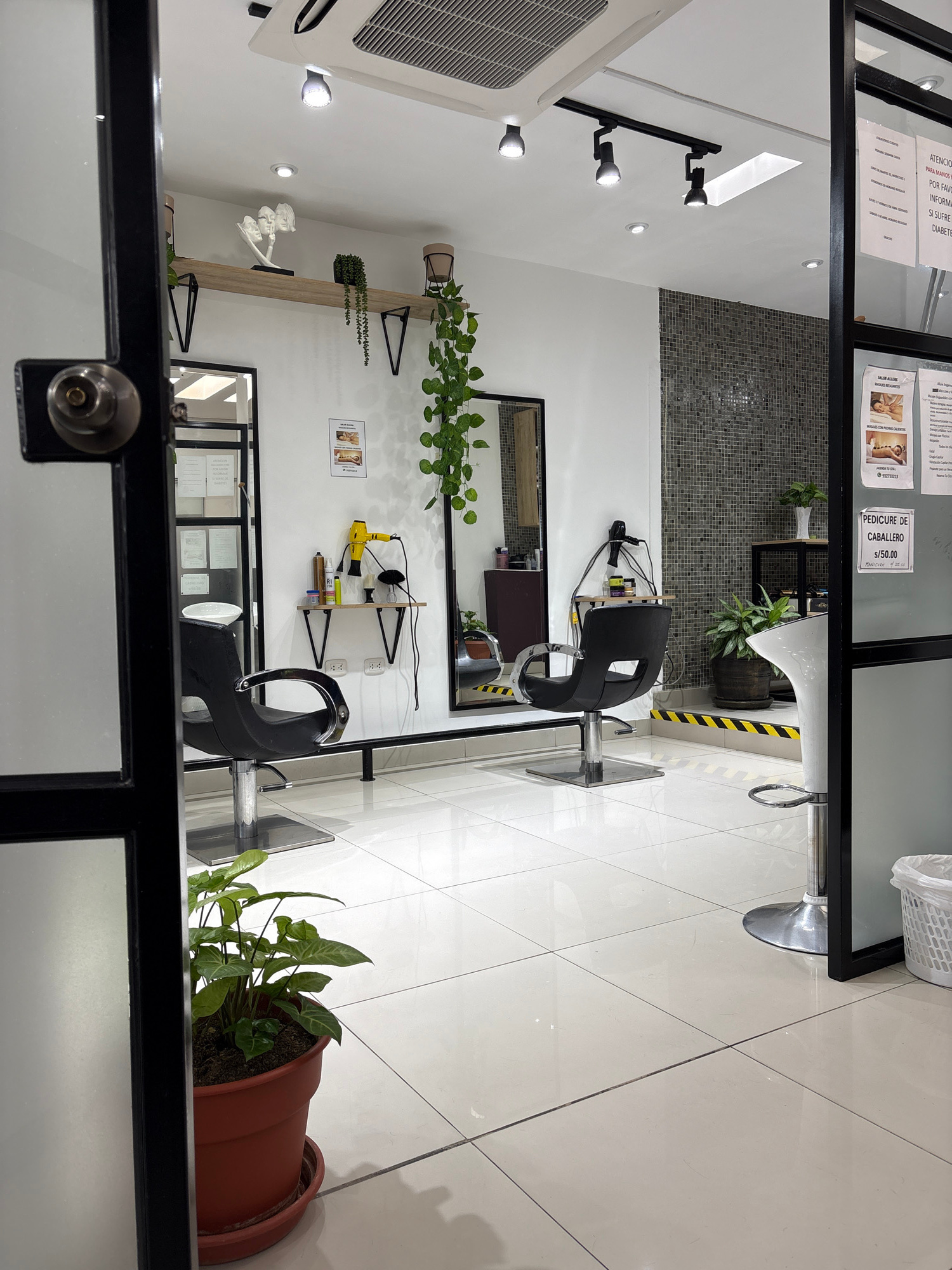 The image depicts the interior of a beauty salon, possibly in Miraflores, Peru, judging by the Spanish signage. The view is through a glass partition or door. The salon features two black salon chairsβ¦read more